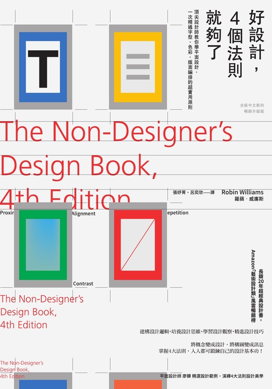 內容簡介 ――――長銷20年超經典設計書,Amazon「藝術設計類」風雲暢銷榜――――建構設計邏輯 × 培養設計思維 × 學習設計觀察 × 精進設計技巧將概念變成設計,將構圖變成訊息掌握4大法則,人人都可鍛鍊自己的設計基本功!★平面設計師 廖韡 精選設計範例,演繹4大法則設計美學★「好設計」練功寶典――「The Non-Designer's Book」總印量逾80萬冊!嶄新的設計圖解 × 全面的設計思考 × 好用的設計實作4大法則讓你成為人人稱羨的設計高手!平面設計是一種溝通工具,想讓報告、履歷、傳單、商品看起來更具吸引力、更有效傳達訊息,其實只需要一點點技巧。二十年來,平面設計界暢銷作家羅蘋透過淺白、輕鬆的文字,歸納整理出超簡單的設計原則,提供實用的設計建議,讓作品呈現專業的樣貌。羅蘋積數十年功力的經典設計力作,收錄大量視覺圖例與文字編排範例,激發創意,讓原本不知哪裡不對勁的版面改頭換面。此外,書中完整討論字體設計和應用的法則,輔以許多小測驗和練習,精煉你的設計眼光。本書是寫給所有需要編排版面的人,沒有任何相關背景、從未接受正式訓練也能簡單上手,在你陷入設計泥沼時拉你一把!適用於任何設計案的4大基本原則、獨家傳授的平面設計祕技、新穎的字型和豐富圖片實例,讓你的設計從此大不同!▌這本平面設計經典入門書可以學到哪些技巧?◎如何運用4大法則做出優質的設計?◎如何為你的設計選對字型?◎如何為你的設計配色最吸睛?◎如何用標點符號和配圖為你的設計加分?◎如何設定字級大小、行距寬窄最專業?▌本書的設計解說可以幫你做什麼?◎學習簡潔編排有效溝通,展現視覺的力量◎掌握色彩的原理和應用,提升美感◎字體搭配更多元,一次弄懂字型的基本知識和運用方法◎了解設計過程中遇到的問題,讓設計變得更有趣◎打破框架自由發想,練就設計之眼▌本書有哪些特色?◎簡單易懂的設計概念,清楚對照的實例說明◎設計案例比較解析,避免容易犯的錯誤◎解讀設計師的構圖和版面編排訣竅,培養好設計鑑賞力◎內附隨堂小測驗,輕鬆檢視學習成果◎收錄「中文字體的設計原則」,更好讀、隨時用▌本書提供哪些設計需求的解答?◎想學平面設計卻不知如何入門?◎想跟設計師合作卻不知如何溝通?◎渴望設計出人人稱羨的專業企畫書?◎希望做出讓面試者印象深刻的履歷?◎希望自己的作品看起來不會顯得業餘?