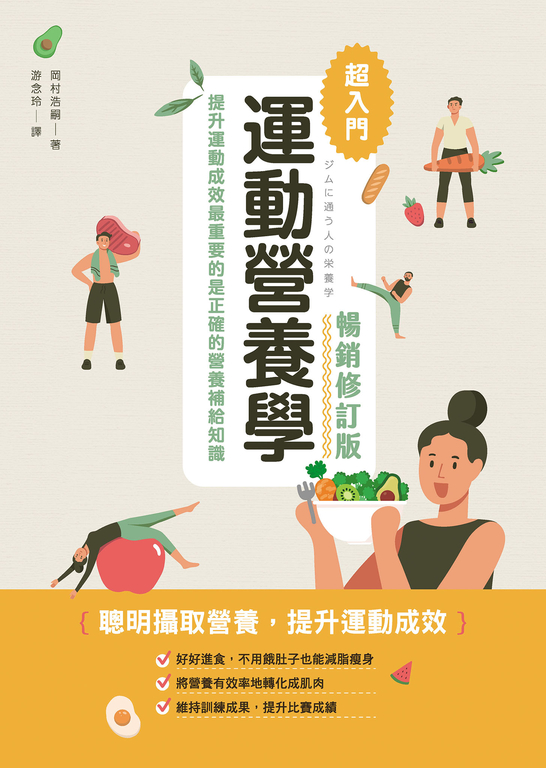 產品目錄 作者序第1章 何謂運動營養學運動營養學與營養效果上健身房運動的人與運動員所需的營養及飲食學習生活中容易攝取的營養學五大類食品出乎意料的優質早餐第2章 運動的效果會因為「飲食」而改變嗎?運動的效果與體能訓練的效果水分補給能量補給運動後的營養補給時機第3章 營養素的基礎知識何謂營養素?營養素的種類與角色營養素過與不及皆不宜食品的成分熱量密度第4章 熱量的基礎知識熱量的單位熱量消耗到哪裡去了?能量來源多餘的熱量將轉變成脂肪累積在體內熱量攝取熱量消耗的算法運動消耗掉的熱量第5章 身體組成與體重管理體重、脂肪組織、淨體組織身體組成的測定方法身體質量指數(BMI)減重與身體組成為什麼會中年肥胖?肥胖體質的基因少量飲食容易胖打造不易發胖的身體第6章 上健身房運動前、中、後所需的營養與攝取方法運動前的必需營養與攝取方法運動中的必需營養與攝取方法運動後的必需營養與攝取方法第7章 健身運動的人平常應攝取的營養與飲食方法以節食、體重管理為目的時以增強肌肉、肌力為目的時以增強體力、提高持久力為目的時第8章 運動與營養補給品運動用的營養補給品無法從飲食中攝取到足夠的營養素時有助於運動的特色營養補充品營養補給品與運動禁藥選擇營養補給品時應考慮的重點營養補給品與食品第9章 運動營養學Q&AQ建構肌肉需要用到蛋白質嗎?Q為什麼我做了肌力訓練卻不長肌肉呢?Q吃魚比吃肉還要好嗎?Q為什麼我做運動也無法減重?Q米飯或麵包之類的主食少吃一點比較好嗎?Q米飯和麵包哪一種比較好?Q運動飲料稀釋後比較好嗎?Q運動飲料會讓人發胖嗎?Q促進脂肪燃燒的運動飲料有意義嗎?Q碳酸飲料對身體有害嗎?Q喝礦泉水能有效補充水分嗎?Q不喝營養補給品就攝取不到運動訓練所需的營養素了嗎?Q大量攝取維生素和礦物質有效嗎?Q含酒精飲料喝多少才是適量?終章 日常生活中多做運動肥胖不是問題,體力才是問題飲食瘦身與運動瘦身不一樣在日常生活中運動的重要性