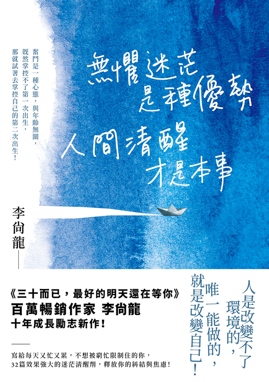 內容簡介 心理勵志百萬暢銷作家李尚龍繼《三十而已,最好的明天還在等你》之後,十年破繭成長勵志新作!寫給每天又忙又累,不想被窮忙限制住的你,32篇效果強大的迷茫清醒劑,釋放你的糾結與焦慮!奮鬥是一種心態,與年齡無關,既然掌控不了第一次出生,那就試著去掌控自己的第二次出生!Don’t think,Just do it!所謂人間清醒,是不管你的人生過成什麼樣子,都別忘了自己的目標。無論什麼時候,永遠都在前行的路上提醒自己──今天,我才剛剛開始。#給曾經不夠努力的你奮鬥的人,他們永遠都在路上,不會彷徨,更不會擔心年歲的增長。別擔心,不管要走多久,你都能到達你心目中的那個地方,擁有失敗過的青春並不丟人,沒有夢想的人生,才傷人。#給與初心走散的你這個世界沒有絕路,我們無須為了坐困愁城而煩惱。迷茫時,跟隨內心深處走,聽不清雜訊時,就聽內心。如果身體走得太快了,就讓靈魂慢慢跟上吧。#給生活一成不變的你今天,永遠是你生命中最年輕的一天,別讓你的人生太無趣,與其清淡一生,不如滾燙人生!#給不敢停下腳步的你停下,是為了更好地出發;世界是大的、宇宙是浩瀚的,我們雖然渺小,但我們正透過努力,讓自己的版圖越來越大。#給越來越好的你以後的每一天都是重生,以後的每一天都要珍惜,不要留下任何遺憾。每一年都有一次海選,每五年都有一次決賽,你是誰,將會被重新定義!【釋放糾結與焦慮的清醒語錄】 當自己迷茫時,跟隨內心深處走。聽不清雜訊,就聽內心吧。 別是老抱怨這世界一片黑暗,抱怨,是阻止前進最有效的方式,而停止抱怨最有效的方式,就是嘗試去行動。 Always have a plan B。 人是改變不了環境的,唯一能做的就是改變自己;所以讓自己變強,懂你的人才會越來越多。 人沒有了退路,才會奮起直追;人沒有了退路,才會破釜沉舟;人沒有了退路,才有機會行萬里路。 這世界其實沒有死路,心死的人多了,才到處死氣沉沉;腦死的人多了,才到處是絕路。 如果這世界上唯一不變的就是改變,那麼能讓自己足夠強大,強大到適應每一次改變和物是人非。 比失敗還痛苦的事,叫從來沒試過。 既然掌控不了第一次出生,便試著去掌控自己的第二次出生──向前走,莫回頭!【豆瓣讀者成長推薦】#「停下,是為了更好的出發」,靜下心來看完這本書,會讓你受益匪淺。#當你感到迷茫、痛苦時,你會停下腳步,記得回頭看看過去,往前探看未來,我們應該要為了生存勇敢前行。努力奮鬥的人,永遠都在路上,步履不停。#尚龍老師的文字勵志滿滿,給了我不想在人生地圖上留白的動力,因為光是看他的文字,就知道他有多努力地在生活著,永遠朝著自己的目標,做著有意義的事情。