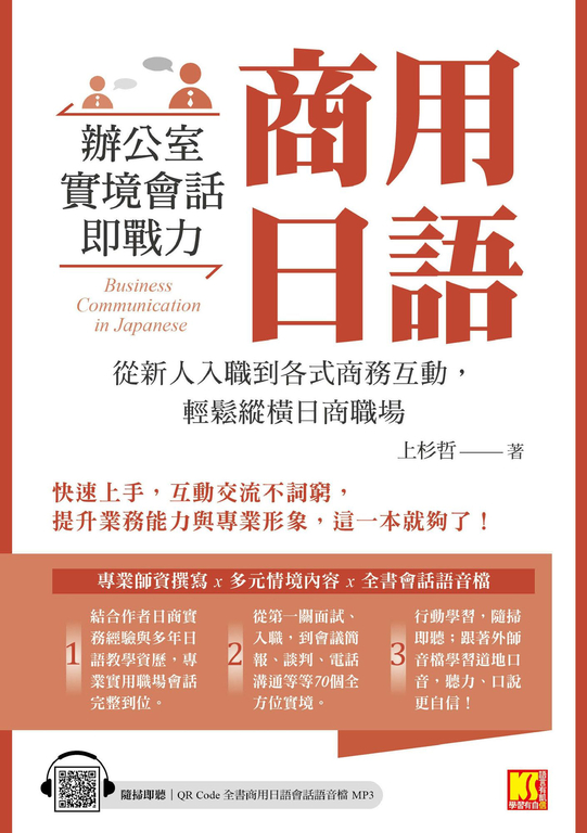 內容簡介 跟日本人工作沒那麼難!只要這一本,讓你溝通熟練流利,職場出類拔萃!與其僅有一般的日文程度,進一步擁有「專業的」職場溝通能力,更為重要!▶本書功用(適用對象)1. 日商、赴日工作或本土企業求職,增加被錄取率2. 需要日文工作者能更適任,建立良好職場關係3. 提升工作品質,更好的職務升遷、加薪競爭力4. 賦予更多的工作選擇(轉職)權5. 自學強化日語能力▶價值性最高★15大職場主題 x 70個模擬情境 x 1400組實用會話 x 1400組替換詞彙★專業師資撰寫 x 多元情境內容 x 全書會話語音檔不論是對內工作事宜,或對外日商做生意,讓你花最少的力氣,精通辦公室/商務實用語,有效強化職場競爭力!▶本書特色:•無縫學習從第一關的面試入職、同事互動,到公司會議、簡報、商務溝通等情境全收錄;同時,商用日語裡特有的表達方式、溝通禮儀、特有習慣學好學滿,溝通順暢,流利專業。•聽說兼具全書單元將聽/說各自獨立頁面呈現;不僅能好好聽懂並理解對方的語意,同時也能完整流暢的表達自己想法,有效地同時鍛鍊並提升聽力與口說能力。•關聯性擴展每一實境會話的關鍵字/句,特別再精選超過十個以上的替換字詞/短句,大量的延伸補充學習,可隨時因應不同狀況套用,表達更生動。另外,小劇場互動設計,模仿學習對話應用,溝通不斷流。•專業語音檔全書實境日語會話全收錄。不僅能聽清楚每一句子的道地發音,更能熟悉日本人自然地說話語速,同步提升口語聽說力,開口更自信!▶職場,不僅僅侷限在辦公室,更要與國際接軌!15大商用主題一次囊括:1新人入職篇2辦公室〔職員篇〕3辦公室〔主管篇〕4電話禮儀篇5會議簡報篇6提案發表篇7公司訪客篇8介紹公司篇9日本客戶篇10商務互動篇11商務互動篇12採購篇13合約篇14商業展覽篇15國外考察篇