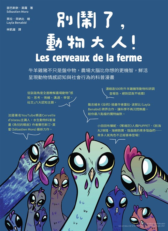 內容簡介 :+:-:+:-:+:-:+:-:+:-:+:-:+:-:+:離經不叛道、離奇又較眞……科學研究的「神」解讀,現在就用最八卦的方式討論動物!:+:-:+:-:+:-:+:-:+:-:+:-:+:-:+:★從詼諧角度全面瞭解農場動物「感知、思考、情緒、溝通、學習、社交」六大認知主題★濃縮逾500則牛羊雞豬等動物科研調查報告,絕對認真不唬爛★法國著名YouTube頻道Cervelle d'oiseau主講人,水生動物科普漫畫《魚兒的眼皮》(Les paupières des poissons)作者賽巴斯汀.莫霍(Sébastien Moro)最新力作★勵志繪本《朵莉》(Dolly)插畫作者蕾拉.波那比(Layla Benabid)跨界合作,讓科學不再沉悶無趣,給你最八點檔的獨特幽默★小田田布蘭妮、《奪魂巨》人偶PUPPET、《航海丸》索隆、海綿飽寶、陰蝨路的眾多陰屍們,眾多人氣角色不正經客串登場!:+:-:+:-:+:-:+:-:+:-:+:-:各路動物愛好者齊聚一堂邀你大鬧一場!(依姓氏筆劃排序):+:-:+:-:+:-:+:-:+:-:+:-: 王建鎧|中興大學動物科學系 助理教授冬 陽|中央廣播電台「名偵探科普男」節目主持人林翰佐|《科學月刊》總編輯黃貞祥|淸華大學分子與細胞生物研究所 助理教授焦傳金|國立自然科學博物館 館長鄭淳予|東海大學畜產與生物科技學系 助理教授 :+:-:+:-:+:-:+:-:+:-:+:-:+:-:⚠️注意:前方800公尺,正港農場文降落!:+:-:+:-:+:-:+:-:+:-:+:-:+:-:咳咳,這可不是內容農場哦,而是關於農場裡的動物(以及牠們可愛的小八卦)。在此之前冷靜想個幾秒,你是否曾嘗試用以下動物,來比喻一個人的個性、情感和……智力? 這人好沒意思,跟牛一樣面無表情他上一場球賽跟山羊一樣亂踢!那傢伙像綿羊一樣奴你的吃相還真像豬!她的智商跟母雞差不多呀~不只是這些日常交談,成千上萬的文學出版品、卡通,以及網路爆笑迷因、哏圖,也都和上面幾個例子一樣,揭示著我們對農場動物普遍的既定印象:對他人超無感的牛杯杯、衝動行事的山羊薯鼠、平靜溫順的綿羊大大、看起來不太聰明的雞,以及胖子代言人阿豬老師。牠們的形象,幾乎被人類的天馬行空給玩到壞掉。如今的我們,除了在餐桌上,已經很難有機會親眼目睹這些動物的真實面貌,尤其是牠們的心理面。作者賽巴斯汀.莫霍為了打破人們對農場動物的諸多成見,細心鑽研500多則科學研究,發現許多不為人知的面向。 :+:-:+:-:+:-:+:-:+:-:+:-:+:-:被謠言害慘了的動物,現身說法!(以下使用化名):+:-:+:-:+:-:+:-:+:-:+:-:+:-:Q:每隻公的肯亞肩峰牛,多半都有個要好的女性友人?牛杯杯:是沒錯啦,但我知道女朋友跟好朋友不一樣,絕對不是渣男歐!Q:科學證實你超會認臉的,難道臉部辨識機器是你? 山羊薯鼠:(傲嬌)對啦對啦,我認得出娜塔莉.波曼跟艾瑪.華森。側臉也可以。化成灰都認得出來。Q:聽說你只是看起來吃草吃到入定,其實思緒已菁跑了好幾公里?綿羊安姊姊:人家不喜歡苜蓿和驢食草,但愛吃鴨茅與羊茅。我還分的出前者是豆科、後者是禾本科。(不可能這麼認真吧!)Q:搖頭晃腦的雞,其實比你想得還不暈。抗暈船大師在這裡?雞米花:數量變化跟排序問題,通通easy啦!而且無論磁場怎麼變,本雞的方向感就是不變,厲害吧~Q:據傳,關於哪家餐廳好吃、什麼時候開門,阿豬最知道?阿豬老師:看不出來吧!而且我們還會評比菜色,2018評委豬年度美食出爐:蘋果、雞肉香腸跟乳酪,真的好吃到我雙蹄比讚!想知道更多農場動物不為人知的祕密?現在就來讀讀這本從一九八〇年代至今,盤點數百篇科學著作總結的科學漫畫吧~它將大大改變你對農場動物的看法!●○專業審訂,請(大腦)安心服用●○現今的臺灣,人們親身接觸到農場動物的機會越來越少,但相信在閱讀這本書後,讀者會受到啟發,想要進一步到身邊鄰近的農場,實地觀察這些動物。──陳志峰/本書審訂,中興大學動物科學系 教授●○連教授也瘋狂,手比心紛紛示愛●○用詼諧簡潔的文字、搭配流暢活躍的漫畫圖說,就把近年對動物行為的重要科學發現,系統地向一般閱眾清晰闡明。即使閒置案頭信手一翻,也能令人再三回味無窮!──王建鎧/中興大學動物科學系 助理教授有別於直接填鴨式的科普,我很喜歡這本書透過實驗設計的介紹,引導讀者理解科學。──林翰佐/《科學月刊》總編輯