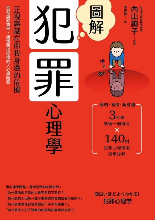 內容簡介 日本圖解書第一品牌西東社,暢銷圖解心理學系列授權中文版正視隱藏在你我身邊的危機!探索失控行為,剖繪犯罪心理,就讓心理學家成為你的安全顧問吧!犯罪,是破壞人與人之間信任的最大傷害。因為不理解,才會更不安!正視犯罪的本質與犯罪者的內心,你我都能盡一分心力建立安全與秩序。知名犯罪研究與心理學輔導專家內山絢子,蒐羅各種罪案研究與心理學理論,直剖犯罪的核心問題。簡明‧易懂‧超有趣3分鐘讀懂一個概念×140則犯罪心理檔案清晰詳解每個人都會害怕他們不了解的東西,本書從心理學觀點,直剖犯罪的來龍去脈:「真的有所謂『犯罪基因』嗎?」「隨機殺人犯的心裡到底在想什麼?」「精神分裂跟反社會有什麼不同?」「為什麼詐騙電話常常能夠成功?」「為什麼家暴的行為很容易演變成不知輕重?」「虐待小動物往往是暴力事件的開端!」「綁架事件其實是成功率極低的營利行為!」「為什麼竟有人以殺人分屍或吃人肉為癖好?」「殘暴的殺人犯,難道不會受到良心苛責嗎?」真的有人天生就是罪犯嗎?‧「犯罪人類學」宣稱,有些人一生下,命中注定就會犯下罪行。‧「犯罪社會學」認為,犯罪不是天生,環境才是容易助長犯罪。‧曾經有學者宣稱,從一個人的顱骨就可以了解一個人的性格和精神特性。‧矮胖型的人容易犯下詐欺罪;瘦長型有精神分裂的傾向;運動員型容易個性執著。誰會是重大犯罪高風險群?‧虐待動物的行為,往往是重大暴力犯罪的前兆!‧戀童癖最後可能越演越烈,發展成誘拐、監禁或殺人等重大犯罪。‧快樂殺人甚至會伴隨破壞屍體、破壞性器官以及吃人習慣!」性騷擾、跟蹤狂、內衣賊……到底是什麼心理狀態?‧如果性騷擾受害女性沒有當場抵抗制止,更容易讓加害人「自行合理化」!‧跟蹤狂的心理都有一個共通點,就是具有依賴性和攻擊性。‧內衣賊往往從包覆女性身體的貼身衣物滿足性幻想。什麼樣的情境或事件特別容易誘發犯罪?‧取締亂丟垃圾、違規停車或任意塗鴉,竟然能有效降低重大犯罪!‧當人被社會粗暴的對待,很容易就將自卑轉為極端的行為去反擊。‧有暴力成分的電玩,因為有得分的機制,更容易提高人們攻擊慾望。‧病態的銘酊大醉腦中會突然出現幻覺或妄想,引發殺人等暴力事件。‧人們成群結黨後,特別容易因為安心感而降低道德底線,引發集體霸凌。犯罪者通常有哪些心理傾向?‧霸凌者往往不擅長維持人際關係,只好將過剩的攻擊欲望指向弱者。‧虐待兒童的雙親,多數都是個性衝動,生起氣來就不顧後果的類型。‧生活並不窮困卻行竊,往往是為了填補心中的空虛感,或是逃避壓力。‧縱火狂常常是患者發現可以透過犯罪獲得滿足或引發性興奮。‧「演技型犯罪」平常都不愛引人注目,懷疑自我認同,意圖證明自己存在。為什麼一個看似正常的人突然會轉變成罪犯?‧因為一點小事情突然會發飆甚至暴力相向,這就是鬱積暴怒反應。‧優等生因為挫折容忍度低,常常驟變成不良少年甚至反社會。‧一本正經的人,往往因戴著面具的姿態與真實的自己產生鴻溝而突然犯罪。★蔡田木 中央警察大學犯罪防治學系教授兼主任、所長 /專業推薦