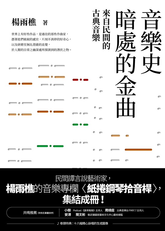 內容簡介 ♫ 神人級作曲家拾取歐亞大陸的養分,拓展音樂想像的疆界♫ 《波麗露》的作者拉威爾、電影配樂的啟蒙者蕭士塔高維契、村上春樹小說《1Q84》裡的楊納捷克⋯⋯這些人是如何「聽故事,作音樂?」♫ 注意:如果不想讓自己的Spotify推薦變得太酷,請不要幫這本書裡的歌單按讚「⋯⋯德布西聽完柯米塔斯的《流浪者》,深深地被亞美尼亞注定漂泊的傷悲感動,他單膝跪地,握起柯米塔斯的右手且說:『你真的是一個天才。』」——音樂史暗處的金曲 第六軌:〈候鳥歸時客死異鄉〉♫ 二十世紀初期的時代感♫ 豐富的民間故事♫ 動人的音樂分析♫ 音樂作品的QR code精選♫ 作者為每一篇故事細心打造的AI生成圖像2018年,一個神祕的音樂專欄在《MUZIK謬斯客.古典樂刊》上開始連載。這個專欄囊括了十四位二十世紀初期的古典音樂家:他們如何將古典樂與來自世界各地(冰島、亞美尼亞、南斯拉夫、土耳其、捷克、蘇聯、波蘭、保加利亞、瑞典、義大利、法國、日本)的民間故事融合,創造出極具新意的音樂作品。這個專欄,叫作〈紙捲鋼琴拾音桿〉,如今集結成冊,成為了《音樂史暗處的金曲》。在構思專欄內容的初期,藝術家楊雨樵首先「奇異地」聽見了楊納捷克的歌詞——Zelené sem sela, červené mi schodí(我種了些青葉,而紅是開出的花)。隨後「拉威爾的《三首歌曲》中的〈妮可蕾特〉也跳了出來。然後是馬蒂努,後面跟著柯米塔斯、萊敷斯和皮普科夫⋯⋯」,這些音樂,彷彿有自己的意志,依序來到了楊雨樵的腦中。他相信這是直覺在告訴他:「這就是你要寫的內容了。」作為一名以民間譚(folktale)為創作核心的藝術家,楊雨樵用非常生動的敘述口吻,重建了十四位音樂家所處的時代風貌、他們與民間故事相遇的精彩始末,以及他對這些音樂作品的精湛分析。除了原本在《MUZIK謬斯客.古典樂刊》上連載的內容,這次集結成冊的《音樂史暗處的金曲:來自民間的古典音樂》還收錄了以下的全新內容:・第零軌 飛渡星球的語言之聲(斯汾-艾立克.貝克,《鶴羽》)・最末軌 一切終將消弭於內心的深太空(卡爾-伯格.布隆達爾 《阿尼阿拉號》)・後記 以筆拾取潛伏之物・《爵士喫茶案內所》、《爵士試聽間》作者周靖庭的專文以及作者精心挑選、製作的:・音樂QR code連結・Midjourney AI V2-V6生成的圖像《音樂史暗處的金曲:來自民間的古典音樂》包羅了深厚的音樂內容、趣味的故事以及精彩的視聽效果。這絕對是一本對所有年輕樂迷、發燒樂迷或未來樂迷而言難得一見的寶物之書。共鳴推薦(依姓名筆畫排序)小樹 Podcast《誰來報樹》主持人周靖庭 古典音樂台 FM97.7 主持人安溥周靖庭 古典音樂台 FM97.7 主持人簡文彬 衛武營國家藝術文化中心藝術總監總監如是說:「內容很扎實,閱讀很輕鬆,極富吸引力」。——簡文彬 衛武營國家藝術文化中心藝術總監
