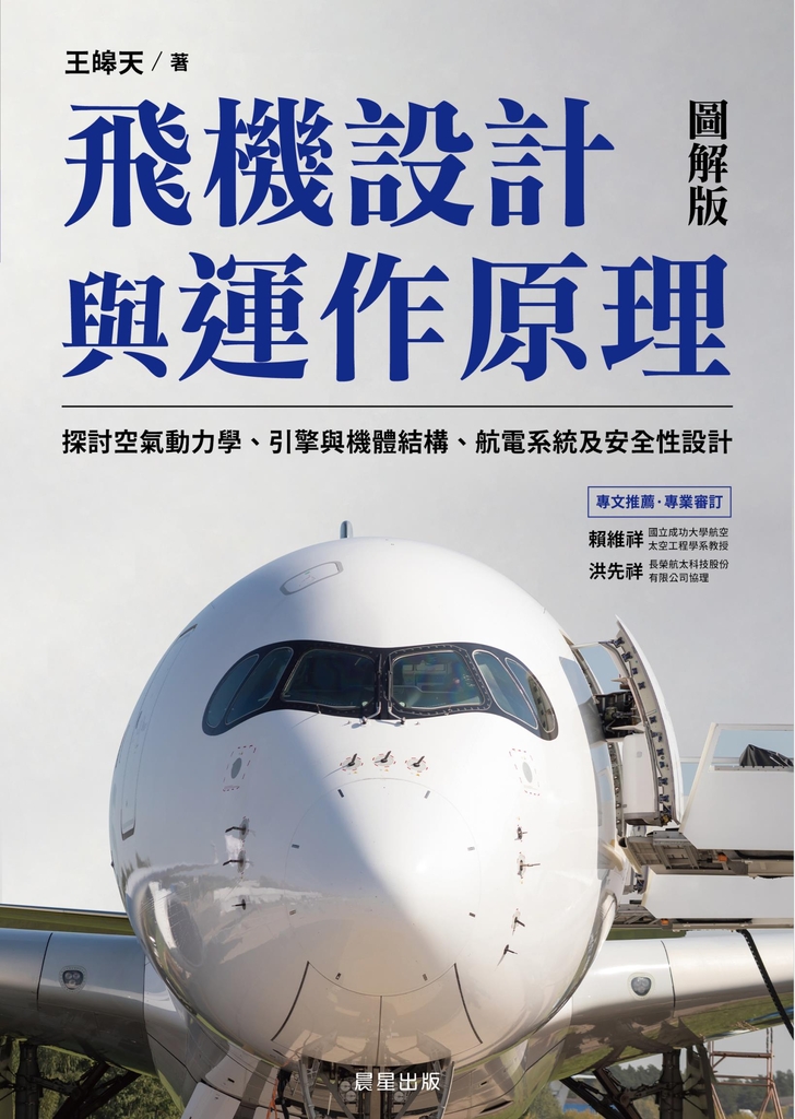 產品目錄 審定及推薦序推薦序作者序飛機各部件介紹第1章 機翼的升力1.1 升力的產生1.2 機翼的翼剖面設計與翼面積1.3 攻角1.4 高升力裝置1.5 機翼上下表面的壓力分布1.6 機翼的立體設計1.7 後掠角與超臨界翼剖面1.8 升力、阻力和推力的關係第2章 機身、機翼和尾翼的阻力2.1 阻力的綜覽2.2 壓力阻力2.3 摩擦阻力2.4 邊界層2.5 寄生阻力2.6 誘導阻力2.7 飛機的總阻力2.8 飛機氣動力外型總整理第3章 尾翼與副翼的配平與操縱3.1 座標系的建立3.2 力與力矩3.3 壓力中心與中性點3.4 縱向的穩定與控制3.5 側向的穩定與控制3.6 方向的穩定與控制3.7 橫向與方向控制的耦合3.8 控制面的設計第4章 航空發動機4.1 發動機的功能4.2 噴射引擎與推力4.3 渦輪引擎的種類4.4 渦輪引擎的構造總覽4.5 壓縮器4.6 燃燒室4.7 渦輪4.8 渦輪扇引擎4.9 進氣道與排氣的設計4.10 熱機循環的熱力學知識4.11 作功的過程與熵的產生4.12 布雷頓循環4.13 影響引擎性能表現的關鍵指標4.14 引擎的噪音控制4.15 引擎性能總結第5章 機體結構5.1 結構設計的重要性5.2 常見的力與力矩5.3 飛機的結構概觀5.4 機身的結構與受力5.5 機翼與尾翼組的結構與受力5.6 起落架的結構與受力5.7 材料的選用5.8 安全係數5.9 機體壽命5.10 結構設計的短板效應第6章 航空電子系統6.1 匯流排6.2 飛控電腦6.3 通訊系統6.4 導航系統6.5 大氣數據系統、攻角感測器與雷達高度計6.6 氣象雷達6.7 電力系統6.8 駕駛艙電子系統6.9 飛行管理系統第7章 次系統與整機安全性設計7.1 飛機不解體──結構的安全性7.2 飛機不失去動力──發動機和燃油系統的安全性7.3 飛機不失去控制(一)──飛控電腦的安全性7.4 飛機不失去控制(二)──液壓系統的安全性7.5 飛機各系統的運轉不會中斷──電力系統的安全性7.6 人員能夠呼吸──艙壓和氧氣系統的安性7.7 飛機能夠安全落地──起落架的安全性設計第8章 飛行表現8.1 水平等高度等速飛行8.2 航程與續航力8.3 水平加減速8.4 爬升與下降8.5 轉彎8.6 起飛與降落結語