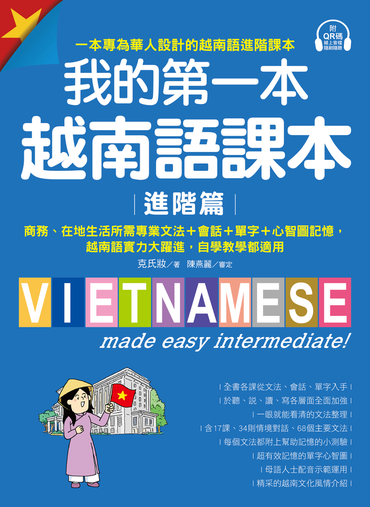 內容簡介 繼暢銷書《我的第一本越南語課本》後,讓本書助你越語程度大昇級!專為華人設計!讓你的越南語學習更精進第一本銜接基礎課程讓你進入進階課程的全彩課本終於上市!進階級文法+會話+單字+心智圖記憶一次帶領學習者進入全新的越南語實力領域全書17個主力課程,內容完全應合越南當地生活必用語句,最反映真實、立即可用的越南語教材!不論商務工作、專業應對、生活閒聊、日常生活,都能用越南語應付自如。採用課程單元式編排,自學、教學都適用!★專為華人寫的越南語教材全新突破繼全台暢銷越南語教材《我的第一本越南語課本》之後,第二本【進階篇】即將隆重上市。在台越經驗貿易發展地更加的深厚的同時,本作將進階地帶你進入在越南當地的生活日常,及商務應用的越南語世界。本書共17課,皆由專業越南籍的越南語教師,針對台灣人在越南生活、經商時會碰到的瓶頸,加以研究並完成的著作。每課以文法開始、再透過會話、單字及討論的練習,達到堅強的越南語實力。書中完全擬真在越南的生活環境狀況,試想當你在一個完全不環悉的環境裡,懂得如何用越南語在當地租房子、跟鄰居打交道、開銀行帳戶。在辦公室裡與當地同事交談、應用電子郵件、並未了維持人際關係使用較深入的話題,書中都能找到。甚至於跟異性拌個小嘴、交流感情、在急診室時表達緊急的病狀,等等諸如此類的重要會話,本書都將不遺餘力教授於您。本作除了是《我的第一本越南語課本》進階之作,程度亦可承接本社其他作品如《全新開始!學越南語》等教材。除了適合做大專院校相關課程中使用外,更適合各大企業的越南語講師做社內培訓教材之用。【更多特色】內容共17課,每課主題下有再細分兩篇相關的文法、會話、單字等主要內容●重點文法每課的兩篇會話前,會先個別提出兩個重點文法(每課總共有四個重點文法)。文法的內容將會讓你認識到更多網路上不易查到,但越南人都會固定使用的表現,讓你開口說越南語時更豐富、正確。文法結束後馬上有練習題,可以快速確認自己是否已經學會。●絕對實用的重點對話使用到前面所學的文法重點的對話,皆不僅實用,而且具有極高專業度,學習後可應用在越南語洽商、會議、生活各場景下。●會話及主題相關的附加詞彙會話後會逐一列出主要單字並附上中譯,不用擔心程度跟不上;此外,每課會提供大量的主題單字,例如:辦公室的課程會有大量的辦公室用品及表現。會議室的課程則有大量會議中需要用到的用語等,皆可一次滿足該場合下的表達需求。●一起聊天吧!每課附有「一起聊天吧!」的單元,書中設有幾個談論主題,這部分是讓教師與學生做開放式的練習使用,可以依題目自由表達,創造更多的學習經驗。自學者也可以與共同學習者或生活中相識的母語人士討論,達到透過互動學到更多的越南語的效果。●單字心智圖每課附單字心智圖,依相同發音的詞彙再延記憶許多不同的單字,學習效率佳。●課後越南相關知識課後附有跟越南相關的深度知識,讓你更進一步地了解「實際生活上的越南」。★ 優質錄音的全教材MP3全書讓您在任何練習都能與音檔同步執行,不僅只有單純的紙本訓練,使學習者對內容有更深刻的印象,越南語永遠忘不了。書中第一頁下方提供全書MP3的下載QR碼,不需註冊會員,或額外安裝自己不熟悉的播放 APP,省去每次聽音檔都要掃描的麻煩!註1:書中錄音南、北音全部收錄,讓您想學哪一種就學哪一種。註2:打包下載檔案為ZIP壓縮檔,請先安裝解壓縮程式或APP再行下載,由於iOS系統對檔案下載的限制,iPhone用戶需升級至iOS 13以上,方可使用全書完整打包下載連結。)