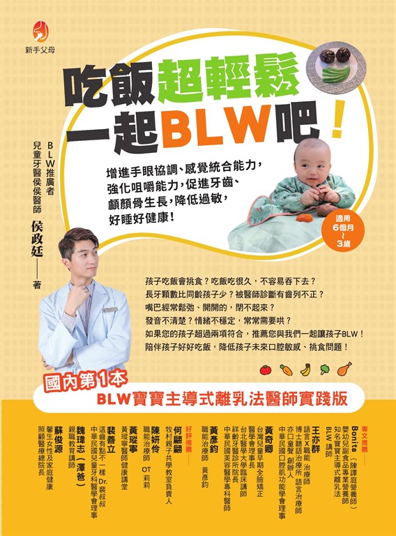 內容簡介 國內第1本BLW寶寶主導式離乳法醫師實踐版孩子吃飯會挑食?吃飯吃很久,不容易吞下去?長牙顆數比同齡孩子少?被醫師診斷有齒列不正?嘴巴經常鬆弛、開開的,閉不起來?發音不清楚?情緒不穩定,常常需要哄?如果您的孩子超過兩項符合,推薦您與我們一起讓孩子BLW!陪伴孩子好好吃飯,降低孩子未來口腔敏感、挑食問題。[適用 6個月~3歲]醫師實證+強力推薦──最實用、輕鬆的寶寶固體食物指南,終結親子的副食品戰爭,讓寶寶為自己的飲食負責,不必再追著餵!〔作者實踐心得〕作者實證1:家庭餐桌自然又簡單,親子都輕鬆沒有複雜的食譜及需循序漸進的副食品表,備料輕鬆,零廚藝爸媽也能輕鬆愉快的享受原味食物及餐桌上時光,不用控制他吃多少、不用一直餵食。作者實證2:第一口就吃原型食物,孩子不偏食第一口食物就是原型、固態食物,孩子的咀嚼能力會很健全的發展,長大後可在餐桌自由地選取他想吃的食物,不用父母再費心剪碎。作者實證3:兒童牙醫推廣的理由,提升孩子的口腔健康改善因精緻飲食產生的長牙障礙、牙床骨狹窄、臉部畸形、舌頭無力(發音障礙)與口呼吸鼻過敏等問題,提升孩童的牙床、臉骨健康。作者實證4:提升孩子各項能力發展,自信又健康透過自己吃,培養孩子的感覺統合能力,並學習用餐禮儀及社交技巧。讓孩子為自己吃的行為負責,「他會非常享受,用餐時光既快樂又自信。」BLW終結親子餐桌戰爭,家長不再追著孩子餵食!一起享受用餐時光。〔什麼是BLW?〕.BLW順應寶寶進食法,讓孩子自然「學會吃」!以自己的步調來實驗食物,鼓勵他發展獨立性。.最實用的寶寶固體食物指南,幫助寶寶發展與生俱來的手眼協調及咀嚼能力。.BLW寶寶主導進食是對媽媽最方便、對孩子最健康的方式,讓用餐時間變得更加愉快。.增加孩子對天然食物的興趣,改善挑食問題,促進咀嚼力、語言能力、消化系統發展,促進顱顏骨發展,有助口腔健康。〔BLW 和傳統餵食的差異〕.BLW 是讓孩子主動抓取食物/傳統方法則是使用湯匙餵食.BLW 鼓勵吃原型食物/傳統台灣餵食法摻雜很多加工品.BLW 不剪碎食物/傳統餵食法常常剪碎食物.BLW 鼓勵讓孩子飲食自己開始、自己結束/傳統餵食法常強迫孩子吃完食物〔專文推薦〕Bonita(陳譯庭營養師)│嬰幼兒副食品專業營養師.知名寶寶主導式離乳法BLW講師王亦群│語言X職能 治療師.博士聽語治療所 語言治療師.亦口童聲 創辦人.中華民國口腔肌功能學會理事黃奇卿│台灣兒童早期全臉矯正醫學會理事長.台北醫學大學臨床講師.祥齡牙醫診所院長.中華民國美容醫學專科醫師黃彥鈞│職能治療師 黃彥鈞〔好評推薦〕何翩翩│牧村親子共學教室負責人陳姸伶│職能治療師.OT莉莉黃瑽寧│黃瑽寧醫師健康講堂裴善立│這齒有點不一樣Dr.裴叔叔.中華民國兒童牙科醫學會理事魏瑋志(澤爸)│親職教育講師蘇俊源│馨生女性及家庭健康照顧醫療總院長