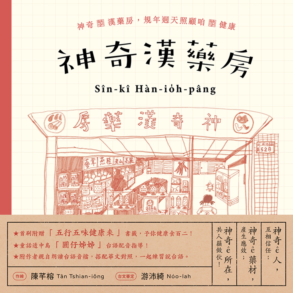 內容簡介 ~神奇ê漢藥房,規年迵天照顧咱ê健康~★第36屆信誼幼兒文學獎入圍你ê記持內敢有一間神奇漢藥房?你捌佇遐拆過啥物款藥仔?阿妹是佇漢藥房大漢ê囡仔,漢藥房內底有幾若个大大ê藥櫥仔,閣有真濟奇奇怪怪ê漢藥材。厝邊隔壁ê人客來來去去,有時陣欲愛囡仔轉大人ê轉骨方,有當時仔入冬欲補身體;神奇ê漢藥房,神奇ê漢藥材,發揮神奇ê應效,予咱ê日子過了健康、四序、心適閣有人情味。◆ 台文審定 游沛綺 Nóo-lah(新竹市本土語推廣協會常務理事)★附作者親自朗讀台語音檔,搭配華文對照,親子共讀時一起練習說台語。★隨書附贈「神奇漢藥房ê四季燖補篇」別冊,予你四季攏會使去拆藥仔燖補!**本書獲文化部國家語言整體發展方案支持**#國家語言主流化 #台語主流化誠有效推薦毛郎中(Dr. Momo毛郎中 本草療癒插畫版主)辛拉拉(「對囡仔講台語」負責人)馬尼尼為(作家)陳秀蘭(嘉義「勇氣書房」店長」)陳雅莉(兒童文學閱讀及說故事推廣講師)陶樂蒂(繪本作家)童嘉(兒童繪本作家)曾琮彥(畫圈圈繪本創作社團團長)鄭順聰(作家,台文推行者)劉旭恭(繪本作家)藍依勤(繪本星球212-7版主)Sylvie(晨熹社繪本書店主理人)名家贊聲《神奇漢藥房》裡不只有攤平的大壁虎、神秘的鐘乳石和苦到咋舌的黃連等漢藥,還有鄉親鄰里的情誼以及與母親的孺慕之情,實在值得一訪。——毛郎中(Dr. Momo毛郎中 本草療癒插畫版主)《神奇漢藥房》開幕矣!足佮意Mimi溫柔ê畫筆kā漢藥房ta̍p-ta̍p-tih-tih幾若百種ê藥材攏畫出來,hō͘阮袂輸mā仝款phīⁿ tio̍h漢藥ê味,綴內底彼隻鸚哥目睭thìⁿ kah大大蕊想欲逐項攏kā看斟酌!(大漢妹仔ê工作桌仔mā足用心咧排列啊!) 《神奇漢藥房》生理有夠好!害阮mā綴咧趕緊(?)毋過毋管khang-khòe偌無閒,阿妹ê阿母永遠就笑微微,這ê本事正經足無簡單neh! 咱kā《神奇漢藥房》掀開就有拆藥仔ê效果,神奇ê繪本,會kā咱人ê記持抾相倚。——辛拉拉(「對囡仔講台語」負責人)早期每一位台灣囡仔攏有去漢藥房的經驗 多謝作者生動活潑的描述;閱讀的當下,我親像擱鼻著當歸、黃耆和洋參的味道。——陳秀蘭(嘉義「勇氣書房」店長」)在溢滿著中藥材氣味的傳統漢藥房裡, 記錄著一段愛的回憶與難以忘懷的情誼, 熟悉親切的台語, 讓整個故事更是瀰漫著濃濃的台灣人情味。——陳雅莉(兒童文學閱讀及說故事推廣講師)頭一擺看著《神奇漢藥房》的初稿,予我想起細漢時佮媽媽去大稻埕的漢藥房看中醫、抓藥仔的記持,彼的芳味總是予我感覺安心佮溫暖。佇漢藥房大漢的作者,用簡單的筆劃,畫出漢藥房的四季佮日常,毋但是伊對囡仔時代日子的懷念,嘛是一款溫柔的提醒,你有多久毋捌行入去漢藥房?——陶樂蒂(繪本作家)溫柔可愛又充滿細節的圖像,傳遞了漢藥房的日常點滴,字裡行間隨著故事散發出淡淡的獨特的懷念氣息。——童嘉(兒童繪本作家)「這我知影!」常常用這句話,開啟跟孩子們介紹過往的記憶。就像當初芊榕老師第一次跟我們分享這個故事的時候,現場夥伴也都看著圖畫驚喜地叫出聲來。是啊!回憶與分享就是這樣傳承下去的,很輕鬆也很自然。這個故事,讓我們可以伴著淡淡的微笑,把母語和過往的文化交給每個大小朋友。——曾琮彥(畫圈圈繪本創作社團團長)這本書很好看耶!透過小女孩的視角,看到一家藥房的日常生活,每位客人都有不同的需求,還得為他們量身訂做。不管是藥材的特性和製作,或者是使用的工具,這些細節都好迷人。小女孩長大了,這些回憶的點點滴滴可以記錄下來,很令人感動!真的是一間神奇的漢藥房!——劉旭恭(繪本作家)古樸的用色打造出了被時光覆蓋的色調,那不只是書中阿妹熟悉的日常,也是身為藥罐子的我小時候最有印象的景色之一。翻開書頁,淡淡的中藥味彷彿也跟著飄了出來。漢藥房裡細瑣忙碌的工作,充滿人情味與熟知顧客需求的對話與互動,在台文的介紹聲中更顯親切。這是臺灣一道動人美好的小小風景,很開心《神奇漢藥房》為我們細細描繪了它。——藍依勤(繪本星球212-7版主)與芊榕熟識多年,我們聽她說故事、看她畫圖,有時候即使只是聊聊書和家常,聽她謙和溫暖的說話,人也會不經意的放鬆、放慢,她果然是漢藥房的女兒啊,自帶如漢藥一般溫潤嫻雅的療癒氣質。小時候印象中街坊裡的漢藥房,藥材散發神秘香味、藥鋪主人熟練的包藥手勢,對我們來說都像是神奇的魔法,即使長大了,我還是覺得漢藥是藏著各種故事的處方,在這樣神奇的漢藥房裡長大,會是什麼樣的童年啊?讀見芊榕的《神奇漢藥房》,我們彷彿聽見她輕輕柔柔的述說著,在藥罐子裡跟著節氣時令更迭的藥鋪日常,那些陪伴街坊鄰居一起生活長大的藥方裡,藏著晨昏冷暖的人情和藥鋪主人的體貼關懷,還有小小漢藥房女兒的恬美童年,縷縷藥香繚繞書頁間。——Sylvie(晨熹社繪本書店主理人)