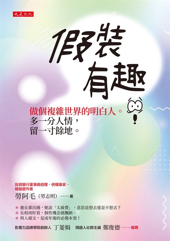 內容簡介 ◎跟人借錢的最高境界不是「借到」,而是借不到,彼此見面還能不尷尬。◎邀長輩出國,她說「太破費」,意思是想去還是不想去?◎與人絕交,是成年後的必備本領!人生苦短,要盡可能找值得的人同行。 作者勞阿毛,本名勞志明,目前擔任投資銀行總經理,是併購專家,工作之餘,最大樂趣就是在微博上發短文, 他經常用輕鬆幽默的文筆,寫職場、寫人生、寫親情,被讀者戲稱「投資銀行大咖、金句連發」的微博段子手。 《假裝有趣》,一語道破人與人之間相處的眉角:有些場合你得裝:例如,跟年長的父母相處,不能實話實說;有些場合不能裝:遇到爛人爛事就直話直說,當場拒絕。想過好日子,得明白個中分寸。 ◎人與人之間,為何會起爭執? .開車與人擦撞,只要沒人受傷就別太計較; 天氣不好導致班機延誤,這是機率問題別為難地勤, 老用情緒解決問題?長相再好看,個性嘰歪就醜陋。 .為啥打牌後,輸贏數字總是對不上? 贏錢的人會傾向說自己贏得少,輸錢的人會誇大損失; 股市正好相反。賺錢時,大家都「裝得像是巴菲特」。 ◎接觸人萬千,友誼不過仨倆。 .友誼標準極高:欣賞、尊重、默契與寬容 真正的友誼要經得起時間考驗,小心那些「沒有老朋友的人」。 .借錢、還錢、分錢的藝術 借錢的核心不只如何借如何還,還要以後見面不尷尬。 還錢的學問是:遠打日子近還錢,時限之前提早還,絕對不能逾期。 分錢呢?投資銀行出身的勞阿毛說:親兄弟也要明算帳。 ◎實話、假話、好聽話,如何運用? 實話雖難聽,但可以讓你避免麻煩,別給爛人任何機會靠近你; 有時你得說假話,誤發簡訊給不該看到的人,你得想個說法圓場。 成年後,如何與父母相處?那就多說好聽話吧。 投資銀行大咖,金句連發: ‧用好君子是本事,用好小人是藝術。 ‧每個大人都曾是孩子,只是後來他們忘記了。 ‧我們對他人的理解,都跳不出自己的局限。 ‧知識改變命運,勤勞改變生活,過程決定了結果。 ‧當買方須謹慎,當賣方要堅決,有多大的腳就穿多大的鞋。