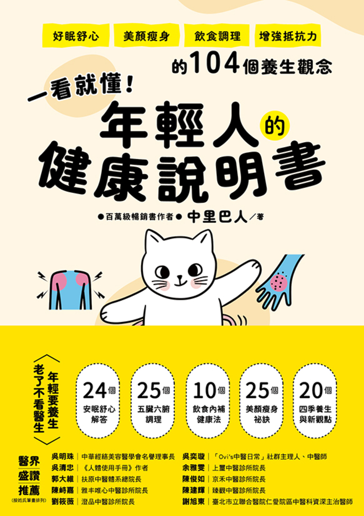 內容簡介 年輕要養生,老了不看醫師,只要認為自己年輕就適合擁有本書。值得「一翻再翻、一看就懂、一學就會、一用就對」的中醫身心養生指南。專業+權威+科學+實用,淺顯易懂、圖文並茂、含金量高,讓你收穫滿滿!✧✧問答說明104個健康觀念,隨時消除身心不適✧✧24個安眠舒心解答+25個五臟六腑調理+10個飲食內補健康法+25個美顏瘦身祕訣+20個四季養生與新觀點。✧✧醫界名人盛讚推薦,年輕人易上手的健康說明書✧✧吳明珠、吳奕璇、吳清忠、余雅雯、郭大維、陳俊如、陳峙嘉、陳建輝、劉筱薇、謝旭東。▍百萬級暢銷書作者中里巴人全新力作,寫給年輕人的健康管理書。作者經過數十年研究,汲取《黃帝內經》、《道德經》養生智慧,以專業、權威、科學、實用兼具呈現,淺顯易懂、圖文並茂解答104個年輕人的身心問題。照顧自己的健康,才能守護全家人的幸福。▍從內到外、從頭到腳保健,快速掌握重點及輕鬆實踐。中里巴人為年輕人提供隨時可實踐的健康養生觀念,從內到外、從頭到腳,詳細解答會遇到的問題,例如:掉髮、肥胖、便祕、失眠、熬夜、口臭、打呼、鼻炎、手腳冰涼、情緒不穩定……,提供預防與改善方法。文字搭配圖表、穴位圖,一目了然,讓使用者快速看懂學會,打造健康快樂的身心靈。▍年輕人會遇到的健康困擾?✧精神壓力大導致失眠,如何快速入眠?✧面臨必須熬夜,如何做對身體的損害最小?✧年輕人禿如其來,怎麼拯救自己的髮型?✧工作時頭昏、頭痛,如何按摩有效果?✧頭髮乾枯、變黃,是氣血不足造成的?✧愛生氣的人,為什麼容易傷肝?✧養腎除了藥物,還有哪些經絡可以按摩?✧便祕真的很痛苦,如何改善這個問題?✧男人到了不惑之年,到底該不該服老?✧聚會時免不了喝酒,喝完後有什麼解酒方法?✧吃白就能補白,吃黑就能補黑嗎?✧吃飽睡、睡飽吃、不運動,這種人怎麼減肥?✧三高又肥胖者,如何讓自己更加健康?✧女性臉色變黃、粗糙、暗淡無光,怎麼改善?✧夏季冷、冬季熱,這種體質如何調理比較適合?✧做手術已經過半個月,可以進行跪膝法?★全文9萬字、問答搭配插圖,輕鬆閱讀、快速掌握重點。★淺顯易懂、不囉嗦解答、含金量高,一次學會全身保健。★專業、權威、科學、實用融合,全方位照護你的身心。★知識與觀念延伸、穴位圖對照,增強內容的豐富性。★翻開任何一頁隨時閱讀,每個問題平均2頁解答完畢。【Who需要這本書】✓ 情緒經常浮躁不安✓ 經常大小病痛者✓ 飲食習慣不正常 ✓ 挑選營養食物有障礙 ✓ 外表比實際年紀老態 ✓ 經常熬夜有消夜習慣的人✓ 身體肥胖找不到方法瘦身✓ 可接受新觀點養生的年輕人✓ 調理五臟六腑,順著節氣養生者✓ 懂得愛自己、懂得養生,希望過上美好健康生活者,都需要它。醫界名人盛讚推薦★專文導讀吳清忠│《人體使用手冊》作者余雅雯|上璽中醫診所院長劉筱薇|澄品中醫診所院長謝旭東|臺北市立聯合醫院仁愛院區中醫科資深主治醫師★養生好評吳明珠│中華經絡美容醫學會名譽理事長吳奕璇|「Ovi's中醫日常」社群主理人、中醫師郭大維│扶原中醫體系總院長陳俊如|京禾中醫診所院長陳峙嘉|雅丰唯心中醫診所院長陳建輝|臻觀中醫診所院長(按姓氏筆畫排列)──吳明珠│中華經絡美容醫學會名譽理事長「在我的門診診療,越來越多年輕人來看一些文明病,也就是所謂的掉髮、肥胖、便袐、失眠、情緒不穩定等問題,針對此在這本書有多方面預防與改善,從內到外、從頭到腳的常見健康養生問題與解答,是一本淺顯易懂,輕鬆學會的保健指南!」──吳奕璇|「Ovi's中醫日常」社群主理人、中醫師「隨著養生意識抬頭,來中醫門診的患者其實很多是年輕人。問診的過程中,他們也常常詢問生活習慣應該怎麼調整?這本書在診間將非常方便做好全面的衛教,也可以提供對健康議題關注的年輕族群更適合之保健書籍。」──郭大維│扶原中醫體系總院長「作者提到現代人最常見的熬夜與失眠悄悄透支著健康,而頭部問題與身體健康關係在臨床屢屢見曉,調理五臟六腑更是中醫的強項,順著節氣來養生是中醫的特色。我是一位臨床醫師,常年在基層診所服務,這本書真的一看就懂,年輕人養生立馬上手。年輕不養生,老了養醫生。」──陳俊如|京禾中醫診所院長「這是一本相當實用的居家自我保健書籍,內容提到許多現代人所困擾的問題與解決方式。養生其實不難,難在能否確實執行並且面對身體給你的訊號,由於過於繁忙導致忽視不少警訊,等到小病已成大病時往往為時已晚,書中的衛教及保養方式都相當簡單也容易上手,即使不懂中醫的你,也能輕鬆看懂學會。」──陳峙嘉|雅丰唯心中醫診所院長「養生,這兩個字很簡單,但是做起來很困難,作者從中醫的角度來教導大家,如何用簡單的方法來維持身心健康,照顧自己也守護家人!」──陳建輝|臻觀中醫診所院長「本書用一問一答的方式介紹中醫的養生保健觀念,從時下年輕人最常見的熬夜失眠、頭部疾病、心理問題、減重等主題,再談論到五臟六腑、四季養生方法,用淺顯易懂的文字,帶領大家認識中醫的養生觀念,是值得推薦的好書。」讀者好評推薦「我買過許多健康養生書,覺得中里巴人所寫最容易懂,讀來輕鬆。這本書將年輕人會遇到的健康問題解析,而且養生改善方法很容易執行,對我來說非常實用。」─