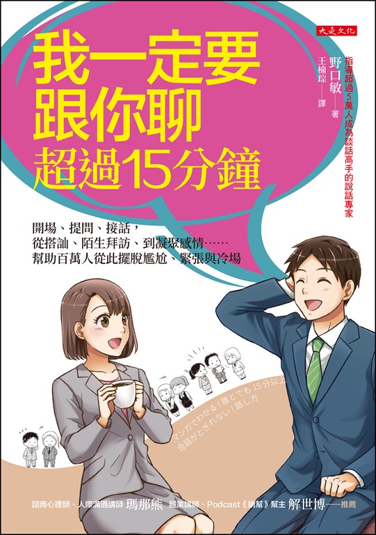 作者介紹 野口敏Good Communication股份有限公司董事長,位於大阪、東京的「說話教室TALK&TALK」主辦人。為許多因會話而感到困擾的人,提供具體簡單的溝通技巧,因此受到大眾好評。說話教室的學員遍布全日本,已有超過5萬名學員,接受指導而改善溝通技巧。專門傳授能在生活中立即使用的對話知識,因教學方式幽默且溫馨,使很多學員都樂於重複受訓。經常為各大企業舉辦員工訓練、幹部培訓等主題講座。主要著作《15分鐘聊出好交情》廣受好評,創下銷售破百萬的佳績。