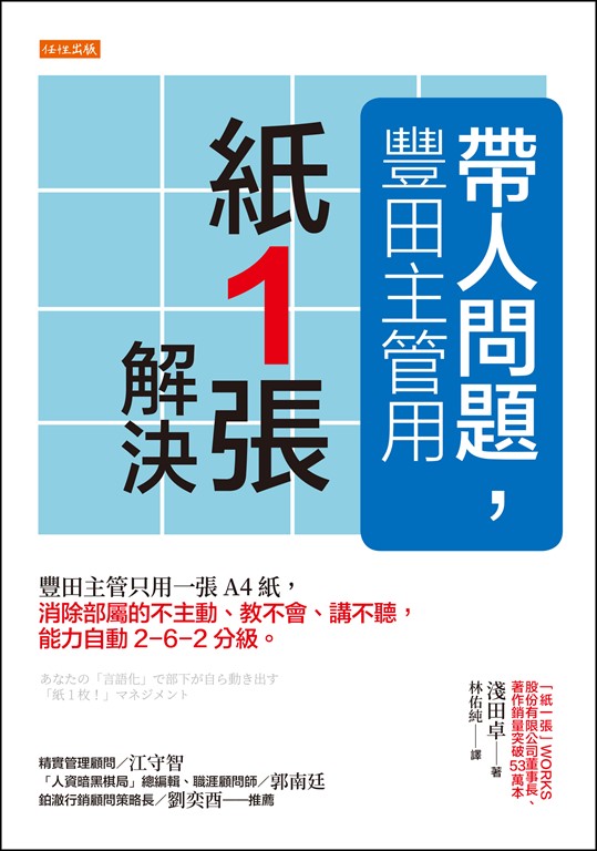 內容簡介 《在TOYOTA學到的只要「紙1張」的整理技術》系列作品,累計銷量突破53萬本!◎明明有100分實力的部屬,卻只交出60分的成績。你不逼他不動。◎新人教不會,老鳥講不聽,所有任務都是我在收尾、收爛攤。◎期待他做得更好,他卻說我在刁難甚至霸凌,怎麼化解?作者淺田卓是「紙一張」WORKS股份有限公司董事長,曾任職於豐田汽車,並學習到「紙一張」工作術,從此致力實踐。之後獨立創業,在豐田汽車與松下電器等大企業,以及中小企業講習、授課。他蒐集超過50位主管關於領導的真實心聲,整理出三大帶人難題:部屬不主動、教不會、講不聽(無法從錯誤中學習),這些問題,都可靠豐田的「紙一張」框架解決,不用天天盯、時刻念。◎不要碎念但要說明工作內容,他就會主動等你指示才動作?因為他不了解考核標準和工作的連結──套用豐田主管在用的4×4表格,請部屬自己書寫、講述、重複工作項目,他就會自動自發。◎新人教不會,老人講不聽,怎麼對話才有感?當部屬問:「為什麼要開會?」你不能光解釋「怎麼做」,而是優先釐清必要項目──開會的目的是?決定哪些項目?今後將採取什麼策略?如何寫會議紀錄、新企劃提案,大家都認同?第四章附上填寫範例。◎豐田主管用一張表格看出誰是人才‧別親力親為,要這樣授權:部屬的工作分三類:舒適區、成長區、恐慌區,你要把舒適區、成長區工作交辦給他──畫表格找出來。別對部屬說:「這個工作能讓你進步,就交給你了!」為什麼?‧給他機會練習,最後總替他收爛攤?因為你沒有考慮到截止期限和他的實力,就將工作分配給他。你得找出「部屬技能稍微不足×但較不緊急」的任務讓他練習。‧「我期待他更進步,他卻說我在刁難甚至霸凌」,怎麼化解?把工作任務畫成表格,不要用語言或情緒指正,就能對事不對人。另外,「工蟻法則」告訴你,員工能力按照2:6:2的比例劃分,最後20%的部屬就算你想教,他們也不想學,所以別浪費時間。書中還附五種常見的人格分類理論,包括:赫曼全腦優勢、類人猿分類……協助你分辨。豐田主管只用一張A4紙,消除部屬的不主動、教不會、講不聽,能力自動2-6-2分級。