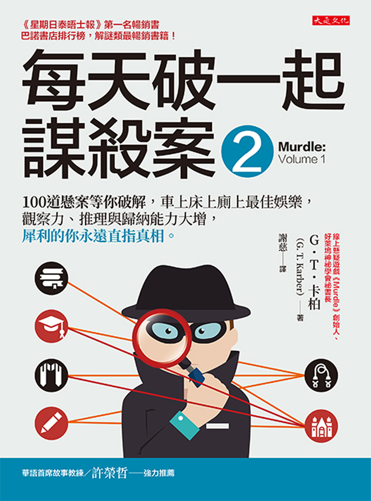 內容簡介 《星期日泰唔士報》第一名暢銷書 巴諾書店暢銷榜、解謎類最暢銷書籍! TikTok網紅@MysteryManon大力推薦 本書是全球破百萬人在玩的最流行線上解謎遊戲 《Murdle》創建者G.T.卡柏所著的同名解謎書。 歡迎來到「每天破一起謀殺案」的犯罪現場, 這是世界上最偉大的解謎者「邏輯客」的官方解謎檔案。 一切就從邏輯客應邀參加一場好萊塢豪宅的奢華晚宴展開, 本以為自己是重要貴賓,可以好好享受一番, 沒想到,一具屍體橫躺在豪宅的大理石浴缸中, 而他的任務(也是你的任務)就是要找出, 誰才是謀殺案的兇手,在什麼地方,使用的凶器是? 案件逐一發生,輪番上場的人物包括:現場表演人體切割術的魔術師, 明明是富二代,卻說自己是白手起家的電影公司老闆, 作品總銷量超過莎士比亞的小說家…… 100起謀殺案,每個案子都不只有一名嫌疑者, 有不在場證明、也有在場證據;有時會留下痕跡、有時只留下味道, 也找到好幾種疑似凶器,涉案者都有作案動機,但真凶只有一位。 你只需要一支鉛筆(也許需要橡皮擦)和敏銳的觀察力, 就可以跟史上最偉(暢)大(銷)的邏輯客一起解開謎團。 如果推理過程中。你的破案思緒卡住了,也不必放棄! 拿出橡皮擦,擦掉你在書上標記的思考路徑,善用作者的一點提示, 你將發現:原來這就是推理、這就是歸納、邏輯思考的過程竟然這麼好玩。 以下是破解完100題的玩家留言分享: 「每天睡前解一題,讓我腦袋清晰,原來我比我認為的聰明。」 「線索、謎題,和密室逃脫愛好者的新選擇。」 「不知不覺已做完了一半,我甚至得限制自己的解題速度,放慢思考, 才不會太快把這本書讀完……警告:絕對讓人上癮。」 「從沒想過我的家人們會因為解謎而團聚在一起,但這本書做到了。 我和我的父母,甚至表親們都人手一本。」 「買了一本給熱愛桌遊的父親。之前,我們兄弟姊妹還得每年開會, 決定要給他玩什麼新遊戲,結果這本打破傳統的書贏得了他的愛。」 書中共有100件神秘懸案等你破解, 這是你樂不思「3C」的更強娛樂,讓觀察力、推理與歸納能力大增。 解題過程中,你會發現自己不知道從哪一題開始,已經形成一種 「直指關鍵處」的犀利思考路徑,破題的推理與歸納過程,你感到暢快淋漓。 你發現,你比你認為的更聰明。