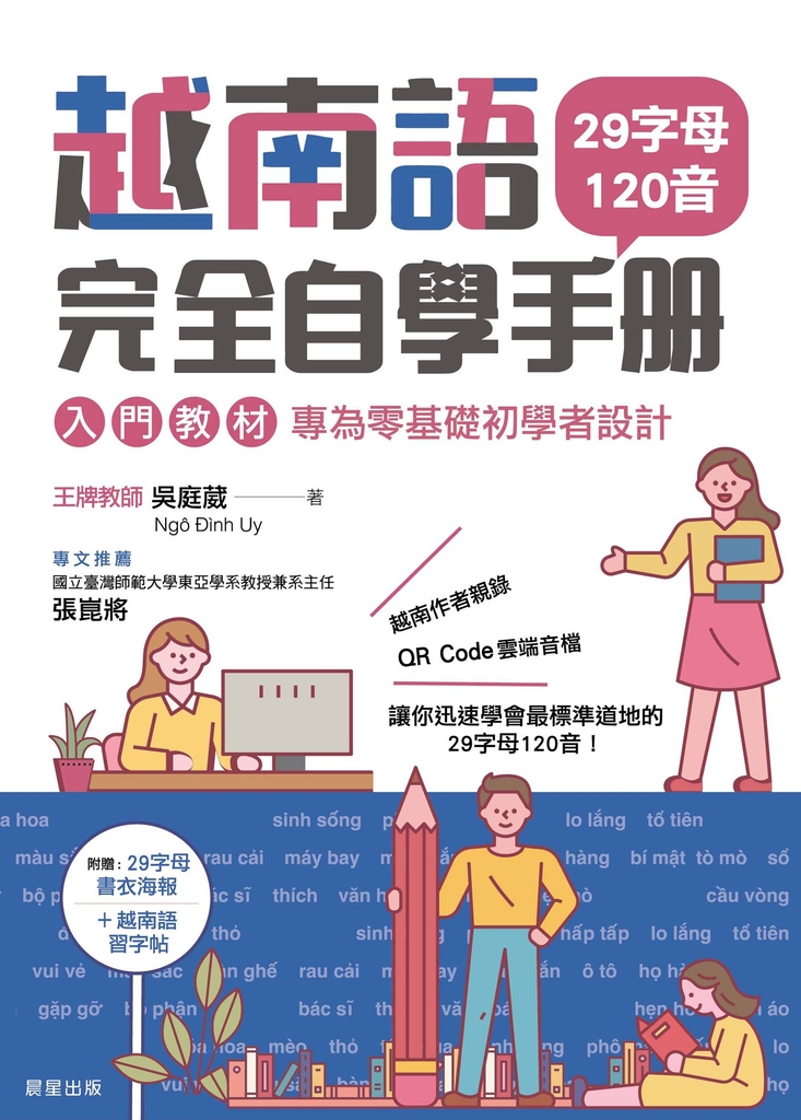 內容簡介 越南語29字母120音完全自學手冊專為零基礎初學者設計的入門教材搭配越南作者親錄音檔讓你迅速學會最標準道地的29字母120音!給渴望學到100%標準發音和語調的你:文字起源+字母寫法+發音技巧+生活單字+短句練習+鍵盤打字聽、說、讀、寫一次到位!只要你會注音符號,跟著老師精心設計的拼音練習就能突破發音門檻保證跟著讀,馬上就會唸!★哪些人適合用這本書自學?‧對於外交國際事務等領域工作感興趣,想學習越南語增加就業機會和未來競爭力的人‧跨國婚姻家庭中,想加強溝通能力、促進彼此關係的人‧想與越南合作夥伴及客戶開創事業、擴大版圖,有實際溝通需求的人‧對越南文化有興趣想多加了解,或者想到越南當地旅遊、體驗、交流的人‧喜歡學習新語言挑戰自我,以及正在規劃自學課程的人……這本專為台灣學生量身定做的越南語基礎教材,能帶領你將過去的語言學習經驗無痛轉移到越南語,透過注音符號、台語和英文輔助發音學習,將有效地引導你快速進入越南語的世界。或許你的學習時間很有限,只想依自己的時間與步調安排進度、循序漸進,一步步掌握越南語的基礎知識,享受學習的樂趣而不是成為負擔,這本書就是最適合你的選擇。★用本書自學可以學到哪些?教你越南語的基礎——29字母和120音的發音、聲調與拼讀技巧,由作者親自錄音示範、解說重點,還會深入介紹越南語的文字起源,以及生活中常用的單字和短句,搭配超值附贈的習字帖,還能學會正統的越南文字手寫筆順。此外,你還會學到如何在電腦和手機上輸入越南語,這對於日常溝通和使用社交媒體將會有非常大的幫助。‧文字起源:完整了解越南文字的起源、歷史與發展‧字母寫法:圖解筆劃順序方向,手寫練習加深印象‧發音技巧:詳細說明發音、聲韻調系統與拼音結構‧生活單字:精選立刻就能派上用場的核心重點單字‧短句練習:現學現說,就是最道地的越南生活用語‧鍵盤打字:簡單學會如何用手機、電腦打出越南語★完成自學後,你可以…….正確發音:讓母語人士聽得懂你在說什麼.掌握聲調:能夠區分和應用越南語的6種聲調.基本拼音:能夠閱讀和書寫一些基本單字和短句.聽力技巧:更容易理解母語人士的語速和口音.日常對話:能夠在日常生活中進行基本的越南語溝通.提升自信:增強使用越南語的信心,比較敢開口說出來總之,使用本書學完越南語29字母120音之後,已打下堅實的基礎的你,將能夠更深入地進行越南語的應用與學習,無論是進階會話、閱讀理解,還是提升寫作能力,都將因此變得更加輕鬆省力。本書特色◎曾獲東南亞語「王牌教師」、「春風化雨」師鐸獎,超過30年資歷的越南語專業教師教你如何輕鬆自學◎專為零基礎初學者精心設計,聽、說、讀、寫全方位越南語能力養成的詳細入門教材◎由作者親自錄製QR Code雲端音檔,輕鬆學習最道地的發音和聲調,自信開口沒問題◎隨書附贈越南語習字帖,一筆一畫圖解筆順,搭配音檔加強記憶,讓你自然而然學會字母寫法