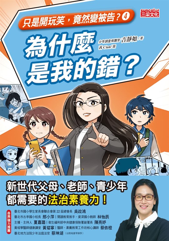 作者介紹 【作者簡介】吉靜如警察大學犯罪防治系畢,目前擔任基隆地方法院主任調查保護官,同時身兼國高中、小學的少年法律常識講師、校外反毒宣導團講師、國中小教師輔導管教法律講師等,大家都稱她為「吉官」。少年調查官主要處理兒童與少年事件中的審前調查與保護處分執行工作,會在事件發生後,從家庭、學校、青少年個人、社區調查青少年觸法相關資料,並經過專業評估後做出最有利於青少年的處遇建議,包括保護處分與安置輔導或感化教育,以少年利益為優先,降低再犯機率,並於各國中小學,針對青少年最棘手觸法問題進行法制教育,做為犯罪預防的前置工作。吉官在少年法庭上累積無數案例,並且在校園巡迴輔導、宣講,切身感覺教學現場需要融入更多法治教學,期許「人權法治正向管教」能夠幫助兒童與少年度過懵懂青澀的成長時光。出版著作:2020年《只是開玩笑,竟然變被告?》榮獲好書大家讀最佳少年兒童讀物獎及中小學生優良課外讀物推介、2021年《只是開玩笑,竟然變被告2》及2023年《只是開玩笑,竟然變被告3》皆榮獲中小學生優良課外讀物推介。【繪者簡介】茜Cian喜歡畫畫的新竹人,擅長溫暖童趣的日系風格。目前主要參與兒童叢書的插畫、漫畫繪製。IG:cianluoo
