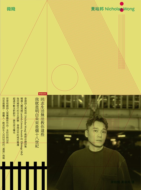 作者介紹 黃裕邦 Nicholas Wong香港詩人、譯者與視覺藝術家,著有英文詩集《Crevasse》與《Besiege Me》,分別於2016、2022年兩度入圍美國「Lambda Literary Awards」文學獎,其中《Crevasse》奪下男同志詩歌組首獎,成為首位獲得該殊榮的亞洲作家。2018年他再憑英文詩〈台北101〉贏得澳洲的 Peter Porter Poetry Prize詩歌獎,同年獲邀以臺北市駐市詩人身份參與台北詩歌節。首部詩集中譯本《天裂》也於同年出版,並入圍Openbook好書獎文學類決選名單。他也曾為曼徹斯特國際藝術節(Manchester International Festival)與紐約古根漢美術館的跨界藝術項目進行創作。2024年受邀參與「愛荷華國際寫作計畫」。