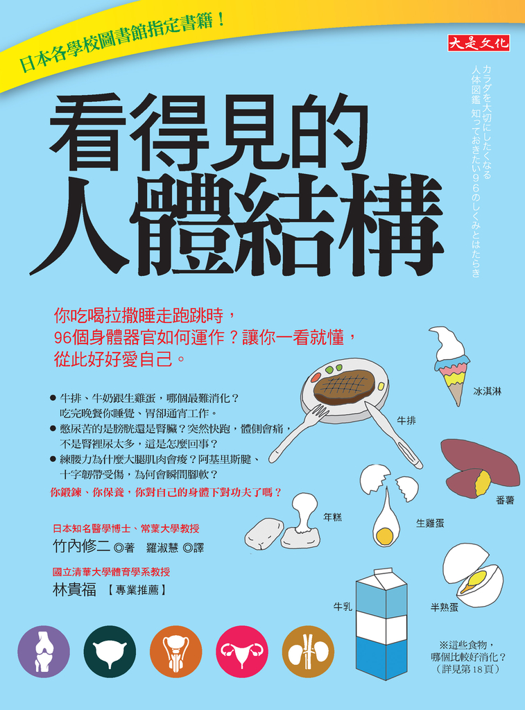 內容簡介 日本各學校圖書館指定書籍!96個器官全部圖解,讓人秒懂的醫學指南。‧牛排、牛奶跟生雞蛋,哪個最難消化?可別吃完晚餐你睡覺、胃卻通宵工作。‧想長壽就得多走動,但折騰的卻是腰。那,怎麼辦?‧憋尿苦的是膀胱還是腎臟?突然快跑,體側會痛,不是腎裡尿太多,是怎麼回事?‧練腰力為什麼大腿肌肉會痠?阿基里斯腱、十字韌帶受傷,為何會瞬間腳軟?人的生命就是靠各個器官在運作,當你吃喝拉撒大享受時,每個器官都會產生相對應的功能,有作用力就會有反作用力。你認為的享受人生,身體哪些組織飽受折騰?你鍛鍊、你保養,你對自己的身體下對功夫了嗎?作者竹內修二是日本知名醫學博士,他將身體分成6個部位,用圖解方式讓你瞭解每個器官如何互相運作,並整理出常見的錯誤認知,因為,人體還沒有進化到完美,圖解說明之後你會更愛自己。◎腹部──人一天分泌1.5公升膽汁胰液,肚子裡發生了什麼事?‧晚餐太晚吃,你睡了,胃卻得徹夜未眠 想吃消夜,你該選全熟蛋還是半生蛋,才比較容易消化?‧怎麼知道肝功能好壞?很簡單,看臉、看眼、看小便,也看酒量。‧你不動,大腸就不動。你吃太油,胰臟會怎麼處置你?‧管你痛左邊還是痛右邊,為何腹部手術都開中間?◎胸部──你休息,他們一輩子不可休息‧心臟有氧運動少不了冠狀動脈、肺靜脈,因為他們要24小時搬運氧氣和營養素。‧動脈怕粥腫,一受阻就會心肌梗塞、腦梗塞;靜脈怕曲張,會出現靜脈瘤。‧感冒喉嚨痛,醫生要你張嘴:啊……。其實他看不到喉,他看的是咽。‧胸式呼吸和腹式呼吸,哪個對身體好?快速衝刺,是練習胸式還是腹式呼吸?◎頭、臉和頸部──有些使用說明你以前不知道‧不用腦?其實腦幹(負責自律神經)、間腦每一秒都得用, 平時得好好保養脖子(因為腦幹就在這裡)。‧聽覺當然很重要,但耳朵更重要的任務是讓你保持平衡。 扁桃腺根本不是腺,為什麼生病會腫起來?‧好茶好酒「好入喉」?喉部有食物你就慘了。因為喉嚨裡的會厭軟骨若沒有 蓋住氣管,人就會嗆到、嚴重的話可能讓食物跑進肺裡。◎你了解骨盆的構造嗎?和你的下半身與下半生幸福有關每個人都說要好好愛自己,可是常常在吃喝拉撒走跑跳的過程中傷害了身體,所以,真想愛自己,請先從了解身體構造開始。