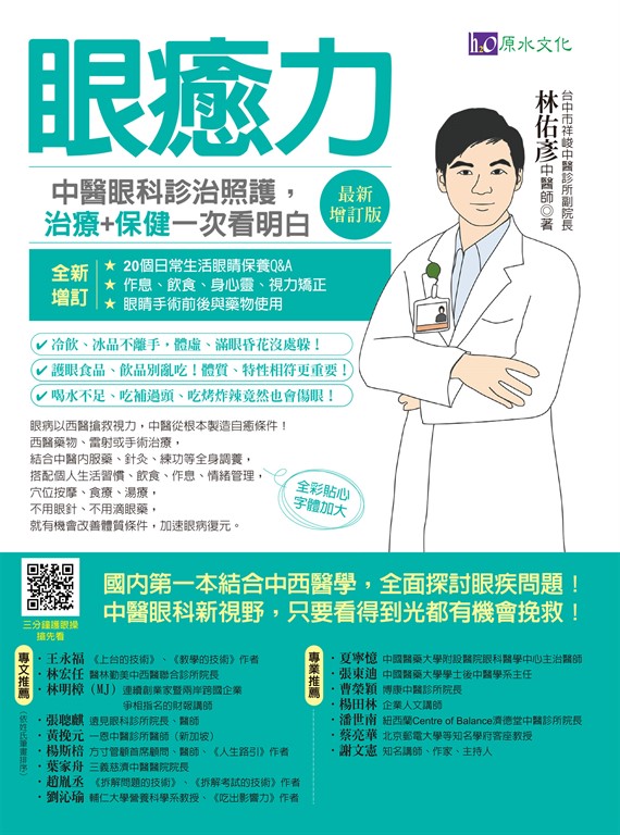 作者介紹 姓名:林佑彥中醫師.台中市祥峻中醫診所副院長2012年12月開始執業,眼病患者累計數萬人;目前每週有超過上百人因眼病前來就診。大多數的眼科疾病很難痊癒,尤其是白內障、青光眼、黃斑部病變、視神經萎縮這一類,但輔以中醫治療都有改善的案例,至於西醫棘手的乾眼症、眼睛過敏、結膜炎、角膜炎、黃斑部病變、部分飛蚊症皆有機會可以痊癒。醫學專業以中醫眼科、中醫內科之診治為主,不斷精進並結合中西醫眼科學,將太極拳、氣功、修行融入臨床實務,且重視身、心、靈之關係,找出患者潛在的壓力與致病因素進而改善身心健康。近幾年開始受邀至國內醫學院、醫院、醫學會進行演講,並持續極積進修,跨領域學習,參加簡報設計、講師培訓、職場管理、溝通、心理等課程。〔學經歷〕中國醫藥大學中醫針灸醫學碩士、中醫醫學士曾任舞生禪中醫診所副院長、宏德中醫診所主治醫師、信德中醫診所主治醫師〔專長〕中醫眼科及中醫內科〔臉書〕林佑彥。中醫師談眼病