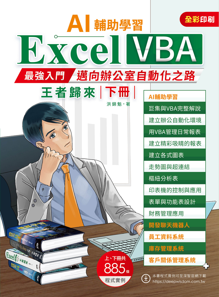 內容簡介 Excel VBA最強入門邁向頂尖高手之路 全彩印刷 第2版☆★☆【功能最多】、【內容最完整】☆★☆☆★☆【基礎入門】、【AI輔助學習】、【專題實作】☆★☆☆★☆【41個主題】、【885個程式實例】☆★☆相較第1版,新增內容主要是「用AI協助我們設計Excel VBA程式,同時增加設計員工資料、庫存、客戶關係管理系統專題實作」,新增內容如下:★ 認識有哪些AI可以輔助學習Excel VBA ☆ AI輔助Debug程式 ★ AI為程式增加註解 ☆ AI輔助學習Excel函數 ★ AI輔助學習Excel VBA程式設計 ☆ AI輔助設計Excel VBA計算通話費用 ★ AI輔助批量更新舊版「.xls」為新版的「.xlsx」 ☆ AI輔助批量更新舊版「.doc」為新版的「.docx」 ★ AI輔助批量更新舊版「.ppt」為新版的「.pptx」 ☆ AI輔助批量執行CSV檔案和Excel檔案的轉換 ★ AI輔助設計Excel圖表 ☆ 用Excel VBA在Excel內設計聊天機器人 ★ 設計員工資料、庫存、客戶關係管理系統 ☆ 其他細節修訂約120處 Excel軟體本身不難,也是辦公室最常用的軟體之一,但是要更進一步學習Excel VBA則是有些困難,原因是市面上的Excel VBA書籍存在下列缺點: 1:沒有循序漸進解說。 2:最基礎的Excel VBA語法沒有解釋。 3:Excel VBA語法沒有完整說明。 4:Excel元件與Excel VBA語法關聯性解釋不完整。 5:冗長的文字敘述,缺乏淺顯易懂的實例解說。 6:Excel VBA實例太少。 7:沒有完整的企業應用實例。 這本書(上、下冊)共有41個章節,其中1-18章是上冊,19-41章是下冊,共使用約885個程式實例完整解說:★ 巨集觀念,從巨集到VBA之路 ☆ AI輔助Excel VBA程式設計 ★ 程式建立與美化工作表 ☆ 從程式觀點徹底認識儲存格、工作表與活頁簿 ★ 資料驗證 ☆ 數據統計、排序與篩選 ★ 樞紐分析表 ☆ 走勢圖與輸贏分析 ★ 視覺化圖表 ☆ 靜態與動態表單設計 ★ 財務管理的應用 ☆ AI輔助更新Word Excel CSV PowerPoint檔案 ★ 在Excel內開發聊天機器人 ☆ 專題實作 – 員工 庫存 客戶關係管理系統 有了上述知識,讀者可以輕鬆將上述觀念應用在人力、客戶關係、財會、業務、管理、分析等自動化工作。