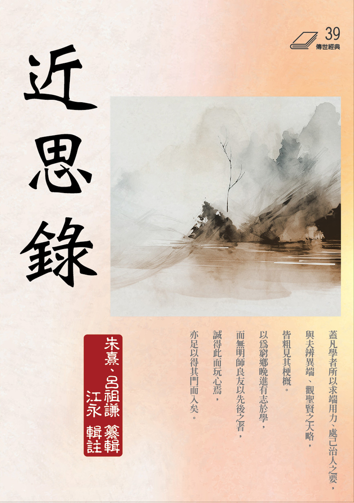 作者介紹 朱熹(1130年10月22日—1200年4月23日),字元晦,一字仲晦,齋號晦庵、考亭,晚稱晦翁,又稱紫陽先生、紫陽夫子、滄州病叟、雲谷老人,行五十二,小名沋郎,小字季延,諡文,又稱朱文公。南宋江南東路徽州婺源縣(今江西省上饒市婺源縣)人,生於福建路南劍州尤溪縣(今福建省三明市尤溪縣)。南宋理學家,程朱理學集大成者,學者尊稱朱子。呂祖謙(1137年4月9日—1181年9月9日),字伯恭,淮南壽州(今安徽省壽縣)人,人稱「小東萊先生」。南宋大臣、理學家、文學家,許國公呂夷簡六世孫、倉部員外郎呂大器的兒子。 呂祖謙出身「東萊呂氏」,生於婺州,以門蔭入仕,起家將仕郎。隆興元年(1163年),進士及第,調補南外宗學教授,累遷直秘閣學士、提舉亳州明道宮,參與重修《宋徽宗實錄》,編纂刊行《皇朝文鑑》。
