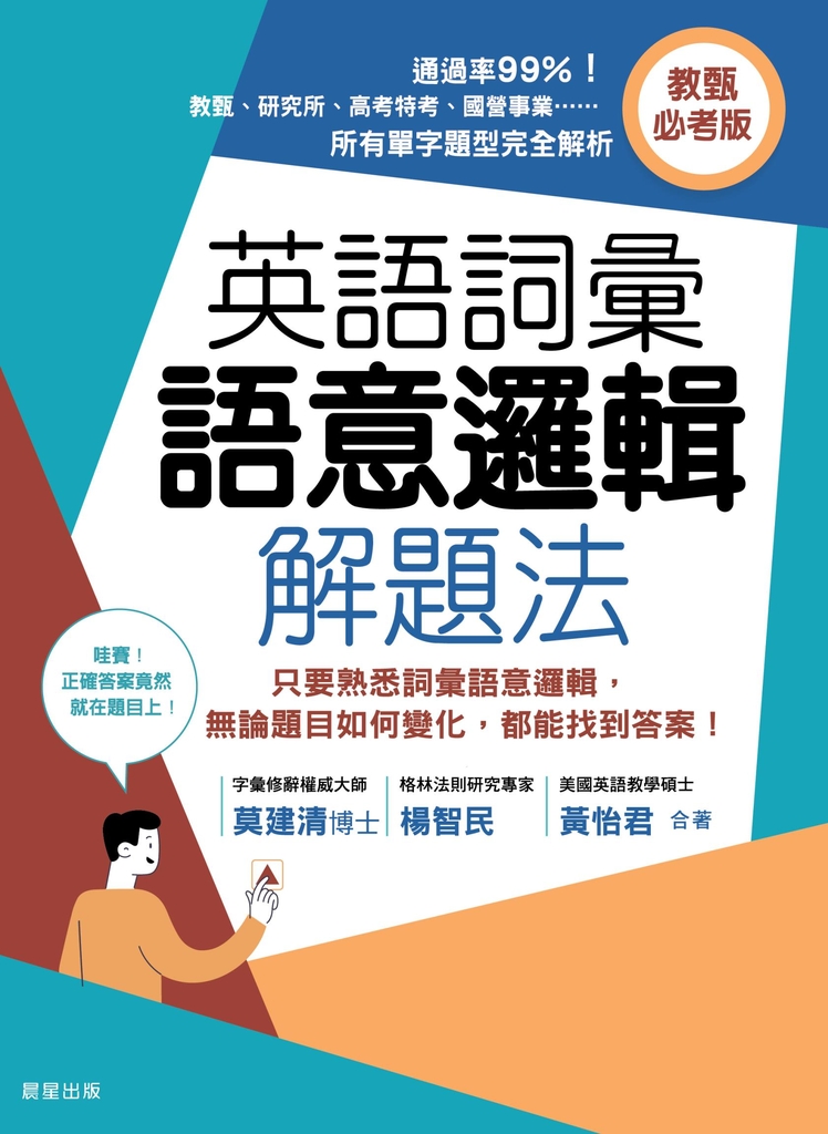 內容簡介 通過率99%!教師甄試、後醫考試、高考特考、國營事業、研究所入學……高難度英語詞彙測驗所有單字題型完全解析助你輕鬆取得高分,順利突破激烈競爭!★字彙修辭權威大師莫建清博士指導★格林法則研究專家楊智民&美國英語教學碩士黃怡君親自錄影解析★教師甄試英語詞彙題四大題型:線上影音精解 https: video.morningstar.com.tw 0170047 0170047.html教師甄試為各級學校篩選適任教師的管道,其試題設計往往具有一定難度,目的在於確保教師具備足夠的專業知識與教學能力,好為國家培育出具有競爭力的下一代。然而,在現行的教甄制度中,英文科的試題難度經常被設定在接近甚至等同於GRE(美國研究生入學考試)的程度,給許多考生帶來相當大的壓力。面對這樣的挑戰,多數考生的準備方法就是大量練習考古題和死記那些自己不熟悉的單字。但是真正進入考場面對生僻單字時,很多人往往只能靠瞎猜或者靠運氣。這種沒系統、沒邏輯的備考方式,會耗掉很多精力和時間。至於報考公職或國營事業的考生還要邊工作邊準備,或者必須一次準備很多科目,大部分的人會放棄範圍較廣的英文科,專注在自己擅長的科目上,這樣其實很可惜。在競爭激烈、錄取率低的考試中,每一分都得斤斤計較,輕易放棄容易拿分的英文詞彙題是不明智的!經過深入分析,考生在高難度英文測驗中不容易拿到高分的主要原因有:一、看不懂生字,只能亂猜;二、腦海裡中翻英的速度太慢,根本寫不完。事實上,準備這類考試的重點不是能背多少單字量,而是在考驗閱讀理解力。如果能夠看懂題目要考什麼、判斷題型、找到關鍵字,就能快速猜出答案,不用一題一題慢慢翻譯,浪費寶貴的作答時間。為了幫助考生應對這項挑戰,本書《英語詞彙語意邏輯解題法》(教甄必考版)教你運用閱讀策略真正看懂題目到底在考什麼,再利用每個人本身就具有的背景知識,結合本書傳授的語意邏輯判斷技巧,讓你從不敢猜、不會猜、瞎猜亂猜,到胸有成竹、有根據有把握地答題。其實,英文詞彙測驗雖然看起來題型千變萬化,但是萬變不離其宗:正確答案往往就在題目上。只要掌握解題步驟和找關鍵字詞的祕訣,就能成為解題高手,在教甄中取得高分脫穎而出!★本書提供「快、狠、準」的獨家詞彙解題攻略1.取樣:閱讀題目全文,判斷題型並尋找關鍵詞2.預測:運用語意邏輯和語境線索推論可能的答案3.檢驗:將猜測的答案填入題目空格,驗證是否符合文意4.確認:瀏覽上下句,確認整體語意邏輯是否連貫★教你掌握12條找關鍵字詞祕訣,成為解題高手1.否定詞2.主詞補語3.形容詞+名詞4.受詞補語5.形容詞6.ly結尾的副詞+分詞/形容詞7.only、even8.副詞片語/子句9.分詞片語10.引號11.表原因的介系詞for12.線索+語境本書將英文詞彙題分為四大類型:But型(對比、反義結構)、Because型(因果關係)、And型(並列結構)、Modifier型(修飾語結構),各章節除了詳細舉例說明文法重點與提示解題線索之外,還提供大量相關考古題解析,一個步驟一個步驟帶領讀者實地演練,並於每單元之後立即安排實戰練習,讓你摸清楚自己的真正實力!除了訓練考生語意邏輯解題能力,同時還能提升文法句型、邏輯思維與閱讀技巧,激發讀者運用靈活思維,面對真實世界時能以得體英語表情達意!本書特色◎一次掌握各類考試英文必考題型與解題技巧!◎運用邏輯猜題,答題又快又準!◎12個「找關鍵字詞祕訣」,助讓你輕鬆解題!◎每道練習題搭配「4步驟詳細解說」,快速掌握解題方向!◎線上影音精解:作者親自線上講解教甄英語詞彙題,考前必看!