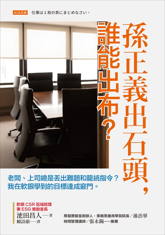 | 商品描述 | 孫正義出石頭,誰能出布? (電子書):◎當老闆說「這個工作就交給你了」,他的意思是?怎麼確認他的期待?◎辛苦寫好的企劃案被主管瞬間推翻,關鍵是你忽略了「打探」── |