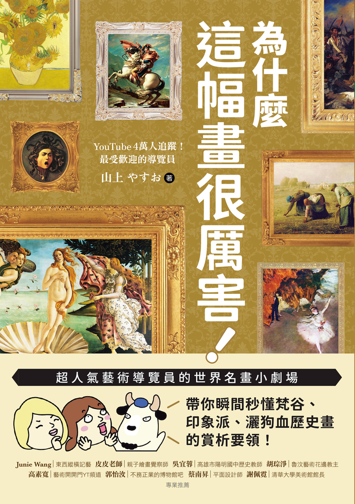 作者介紹 作者簡介山上やすお(Yamagami Yasuo)藝術解說員、美術系YouTuber。在日本擁有博物館學藝員和口語表達專家的證照。自2015年起為了傳遞藝術的樂趣,開始舉辦主題為「娛樂藝術」之講座,總參加人數超過一萬人次。在YouTube上經營「小山羊老師的美術教室」,利用活潑的插畫與幽默的解說方式,教大家輕鬆鑑賞名畫,持續分享著快樂學習藝術的資訊。同時也以藝術相關的電視節目主持人和插畫家的身分活躍於業界。YouTube:こやぎ先生の美術ちゃんねる(@koyagi_sensei)譯者簡介李亞妮專職日文譯者。翻譯時一併吸收新知,供給我偌大的養分。聯絡信箱:[email protected]