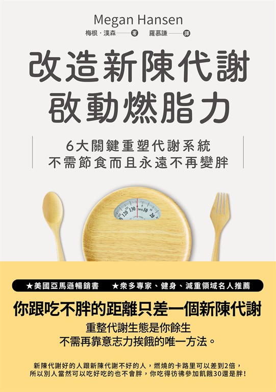 內容簡介 這是完全可以執行一輩子的健康方案,是永不復胖的唯一解答。你和吃不胖的人之間的距離只有「新陳代謝」四個字。重整代謝生態是你餘生不需再靠意志力挨餓的唯一方法。★美國亞馬遜暢銷書★眾多專家、健身、減重領域名人推薦新陳代謝好跟不好的人,燃燒的卡路里可以差到2倍,所以別人吃好吃的也不會胖,你吃得彷彿參加飢餓30還是胖!想要躺著看Netflix也在燃燒熱量嗎?這本書就是要教你拿回選擇的主導權,選擇讓身體的代謝系統回歸正位。你是不是有以下困惑:◆ 為什麼別人總是吃不胖,我都吃那麼少了還是越來越胖?◆ 為什麼我長期飲食控制,但還是一直瘦不下來?◆ 為了瘦、為了健康,我是不是這輩子都不能吃好吃的了?◆ 年紀變大就是會胖,我這輩子沒救了→ 以上的答案全部都是跟「新陳代謝」有關。我們一直被飲食產業輸入「減肥成功的關鍵就是少吃多動」,但現在的研究和經驗都可以證實這個理論是錯的!是時候了解代謝的真正運作了。只要掌握6大代謝系統關鍵,不需節食、不用靠意志、完全可以執行一輩子的健康方案。◆ 六大代謝關鍵1. 血糖控制:維持血糖穩定2. 肌肉:身體最大的本錢,不但讓你瘦又讓你健康3. 活動:在日常生活中保持身體的活動4. 良好的睡眠:是修復一切的萬靈丹5. 壓力管理:掃除燃燒脂肪的阻礙6. 健康的腸道:慢性發炎的腸道不利減重作者的做法跳脫傳統的瘦身飲食法,不局限於計算卡路里,不限制飲食,而是把新陳代謝的知識傳授給讀者,如此將選擇食物的權力交還給讀者,並且以「健康的體型」為目標而不是體重。然而,生活中總是會充滿意外,因此無須追求完美,應留給自己靈活應變的空間,不要給自己壓力!遵循80 20法則,六大支柱只要把握其中80%即可! ◆國外專業推薦「最後 ……這是飲食業『少吃多運動』口號急需的解藥!我喜歡梅根的身心整體減肥方法,正是這種方法幫助我最終擺脫了節食並治癒了我的新陳代謝。她還提供了寶貴的工具,可以幫助您挖掘潛意識,從而實現真正的行為改變和長期結果。必讀! ——凱蒂·威爾斯,WellnessMama.com 創辦人「梅根為健康和保健領域帶來了一股新鮮空氣。她與身體如此協調,並以平易近人的方式幫助人們了解什麼最適合他們。在健康和減肥方面,這並不是一刀切的,沒有人比梅根更了解這一點。我強烈建議將新陳代謝改造添加到您的健康工具箱中。 ——羅琳‧伯斯蒂克(Lauryn Bosstick),Skinny Confidential 品牌與網站創辦人「梅根確實強調了鍛鍊健康肌肉的重要性,而這一點在減肥談話中經常被忽略。很棒的指南! ——嘉比瑞·里昂 博士(Gabrielle Lyon),肌肉中心醫學研究所創始人「梅根改善新陳代謝的全面且相關的方法對於每個因『少吃多動』過時的營養理念而感到沮喪的人來說絕對是遊戲規則的改變者。新陳代謝改造為您提供了最終所需的劇本「如果您非常關心自己的整體健康和福祉,並且想要一本真正能夠幫助您最終克服體重管理和心態的指南,請將這本書列入您的必讀清單。梅根打破了健康新陳代謝的真相,並提供了可行的步驟,以一勞永逸地做出真正持久的改變。這是必讀的! ——蒂娜·安德森,Just Thrive 執行長兼聯合創始人「我如飢似渴地讀了這本書。這讓我笑了;這讓我哭了;這讓我思考並重新思考。我將把這本書送給我生命中所有需要專業知識的女性。梅根的文字充滿力量和變革性,它們讓讀者有勇氣擁抱自己的傑作和正在進行中的作品。她教導讀者在人生的各個階段,深入了解自己的真實身份。」—— 艾琳‧尼奇克(Erin Nitschke)博士,ACE 健康教練、健身營養專家和治療運動專家