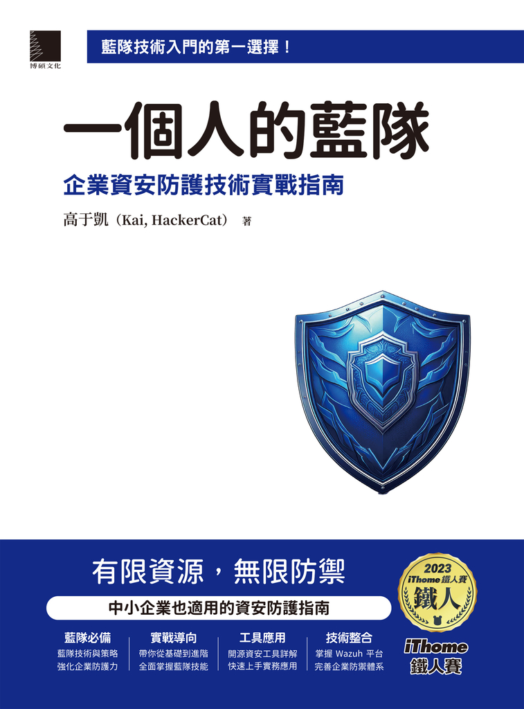 商品描述 | 一個人的藍隊:企業資安防護技術實戰指南(iThome鐵人賽系列書) (電子書):在數位戰場之中,藍隊作為企業組織資安防護的關鍵角色,不少公司都會打造堅韌的防禦團隊或是採 |