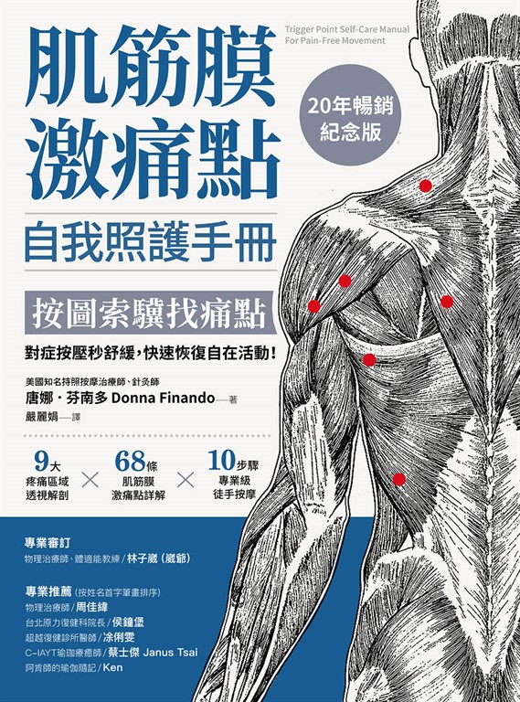 商品描述 | 肌筋膜激痛點自我照護手冊(20年暢銷紀念版) (電子書):本書簡介9大疼痛區域×68條肌筋膜激痛點×10步驟徒手按摩按圖索驥找痛點,對症按壓秒舒緩,快速恢復自在活動! ◎ |
