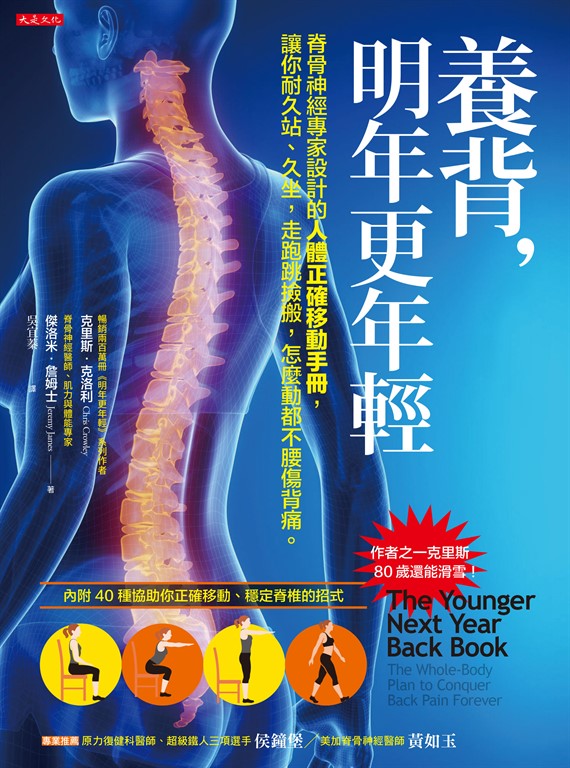 內容簡介 「因為背痛,我十幾年都無法自己繫鞋帶,傑洛米醫師卻幫我治好了。」──五十多歲的男性背痛患者 「感謝傑洛米醫師,讓我80歲了,照樣滑雪、騎自行車、划船,到各地演講。」 ──本書共同作者克里斯‧克洛利(Chris Crowley) 「你怎麼綁鞋帶?」「彎腰」,「不屈膝?」 「我可以瞬間彎腰撿地上的東西,再瞬間起身。」 「站立時脖子總不自覺的往前伸……。」 老是「下床扭到、甚至是睡覺時翻身扭到」嗎? 你也經常這樣移動身體?美國脊骨神經專家傑洛米‧詹姆士(Jeremy James)說, 就是這些姿勢,讓你的腰與背快速老化,越來越痠痛。 背痛,真的不是病,但嚴重時,能搞砸你的事業、破壞婚姻、失去生活自主能力, 美國患者每年平均花新臺幣75,000元,只為了緩解症狀,無法完全治癒。 背痛,真的無法自癒嗎? 當西醫告訴你,唯有動手術才能好時,你要挨一刀嗎? 本書作者傑洛米是脊骨神經醫師、肌力與體能專家, 從十幾歲擔任運動員後,就和背痛長期抗戰。 他因此研發出40種強健核心肌群、穩定脊椎的招式,並親自實踐, 成為該療法首位的痊癒者,而且不再復發,至今已幫助超過一千人以上改善症狀。 ‧正確走跑跳,背部不受傷 你喜歡打高爾夫球、練瑜伽、園藝? 小心,這些看似健康的活動,都是最傷腰背的運動之一。 還有,如果你整天都用同一種姿勢站著(櫃姐)或坐著(上班族), 當心,你的背會出現「潛變」:讓你脊椎受傷的主因。什麼是潛變? ‧久坐,害你的屁股失憶了,快點把它喚醒 超過半數以上的背疼,來自你的屁股(臀肌), 當你長期把它當坐墊,就會患上「臀肌失憶症」:久坐導致肌肉無力。 當臀肌失憶、依賴脊椎施力,你的脊椎就會宛如山脈瞬間輾成石礫……痛痛痛呀! 萬一,你的工作就是得久坐,正確坐姿該如何? ‧站穩了再走,走穩了再跑 你的走路姿勢正確嗎?可以試試躺著做「空中踏步」的動作, 如果你的背不會痛,表示實際走路時同樣也會很輕鬆。 還有,怎麼跑、怎麼跳、怎麼撿重物才能不傷背? 一旦移動的方式出錯,背就會透過疼痛警告你。 本書內附40種協助你正確移動、穩定脊椎的招式, 像是:蚌殼式、四肢伸展式、分腿蹲式。 無論你是職業運動員,還是上班族,每天只要練習10分鐘, 正確走跑跳不受傷,一千位以上患者實證有效。 本書另一位共同作者到了80歲,照樣滑雪、騎自行車、划船,腰背超有力。