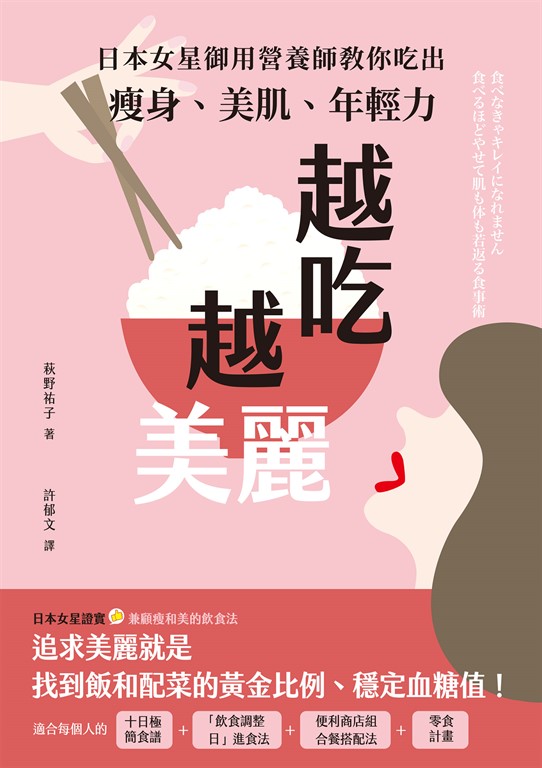產品目錄 簡介前言第1章 為什麼「不吃」就沒辦法變美?善用食物的力量,讓自己變美麗釋放「忍著不吃」的壓力禁食或十六小時禁食法真的有效嗎?限制醣質與不吃碳水化合物的減重法的真相缺少「燃料」,減重與重訓都無法成功「均衡飲食」是怎麼的飲食內容?過度攝取蛋白質的人快速增加中要擁有每個細胞都水水嫩嫩的美肌,就要從吃「白飯」開始美麗的人選擇「美食」更勝「低卡路里」的理由「一步步變美麗而且樂在其中」的三個祕訣打造讓心理穩定的體質,當然要重視「進食」美麗專欄 注意「葡萄糖耐受不良」問題,打造易瘦體質第2章 你的身體由「攝取的食物」打造便祕的煩惱就是「正常進食,通暢地排泄」比起完全戒醣,「一天三餐攝取醣」才能打造易瘦體質攝取「不易變胖的醣」讓脂肪燃燒比起超級食物,和食更適合日本人不用「一天吃三十道菜」也能變得漂亮在便利商店解決三餐時的「組合餐」選擇可以想像原本模樣的食物御飯糰的配料該選擇「鮭魚」而不是「美乃滋鮪魚」吃麵包請選擇「三明治」或「起司吐司」,不要選擇「菠蘿麵包」吃肉排,「牛排」比「漢堡排」更理想走進牛丼店,選擇「牛肉盤」比「牛丼」更好牛奶挑「低脂」,優酪乳選「零脂肪」「不想吃魚」,就吃「鯖魚罐頭」買油時,比起「買到賺到」的大罐油,「小罐油」比較理想吃油炸食物時,「內用」比「外帶」理想比起「鮮切蔬菜」,「冷凍蔬菜」更適合料理比起「果昔」,「味噌湯」更適合早餐要外食,選擇「看得見廚師的店家」而非「連鎖餐廳」美麗專欄 「早餐到底該吃什麼?」的終極答案第3章 變美麗的飲食習慣「咀嚼」比任何減重方式更能幫助我們變美「第一口咀嚼一百次,第二口咀嚼三十次」是胃腸的終極訓練唾液是「免費的美白精華液」,越咀嚼越促進青春荷爾蒙「咀嚼」也能瘦臉與修飾臉部輪廓早餐要「一起床就吃」「用蔬菜汁代替蔬菜」可以嗎?不要超過八小時才吃下一餐追求美麗的黃金比例為「白飯6:配菜4」遵守「先吃配菜的原則」,先喝味噌湯再吃米飯讓睡眠品質大幅提升的「晚餐祕訣」喝完酒,記得吃點東西做結尾吃太多﹖隔天重新來過就好零食要「有計畫地」吃比起在早餐吃水果與優酪,在餐與餐之間吃最理想別讓甜飲料取代主餐發酵食品雖「營養」,但更應在日常飲食中活用發酵食品的「美味」美麗專欄 服用營養補充品的最佳方式第4章 利用「若玄米」澈底排毒話題食物「若玄米」是什麼?利用煮白飯模式就能輕鬆煮熟的「若玄米」一天吃五碗米飯,直到餵飽自己為止「吃飽吃美」的飲食方式適合這些人基本菜色就是米飯、蔬菜味噌湯與富含蛋白質的配菜「滿滿蔬菜的味噌湯」十日極簡食譜不愛吃糙米的人可以從「白米+雜糧」開始追求美麗的人絕不嘗試的三種飲食方式將「享受日」與「調整日」的飲食分開專為遠距工作設計的單日簡單菜色美麗專欄 購買若玄米的方法與保存若玄米的方法第5章 戒掉壞習慣,培養好習慣,就能加速變美麗放下「吃了就會變胖」這種成見放下負面的想法,就能擁有易瘦體質如果內心快要崩潰,就調整飲食吧擺脫「減重宿命」的三個祕訣「樂在其中且持之以恆」的飲食方式戒掉「一天兩餐」、「一天一餐」的壞習慣就不易變胖減重成功的祕訣:明確勾勒出「理想的自己」特別小心「乍看之下很健康」的食物用餐之後,不要懶散地坐著滑手機分心吃飯會變胖滿腦子想吃的人該立刻戒掉的壞習慣就算不再站上體重計,也能保持一生美麗比十年前的自己更有活力、變得更理想的理由結語