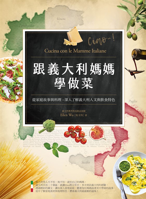 內容簡介 耗時5年,深入探訪義大利八大美食區,專文介紹24款特色食材×8位義大利媽媽拿手的56道料理!美食、美味、美景與迷人的故事與生活,這本書全部一網打盡!耗時5年,深入探訪義大利八大美食區,專文介紹24款特色食材×8位義大利媽媽拿手的56道料理!美食、美味、美景與迷人的故事與生活,這本書全部一網打盡!不只有古老的文化與美麗的風景,而是讓您見識到不一樣的義大利。請跟著作者Ellen一起去體驗一般觀光客無法看到的那一面,深度了解義大利美食文化與生活、當地特色食材及所有令人感動的溫暖料理。Chiara Petro’ 裴明琦(義大利在臺協會主任)徐仲(飲食文化研究者)王瑞瑤中廣「超級美食家」節目主持人王嘉平(義菜名廚)肯定推薦(以上依姓氏筆畫少至多排列) 當有人問:「這道菜是誰做的?是誰教你這道料理?你最想念誰做的料理?」大部分人的答案應該都是:「媽媽、我媽媽。」為什麼選擇跟義大利媽媽學做菜?因為義大利跟台灣很相似,「媽媽」是大多數家庭的精神領導,義大利男人天不怕、地不怕,就怕自己的媽媽。 擁有美麗的自然風光與許多文化遺產,而被稱為美麗國度的義大利,它的地圖外觀長得像一隻傾斜的馬靴,長長的馬靴就分成二十個區了,每個區所住的人民有不同的個性與飲食習慣,更因為得天獨厚的地形,而產出許多的特色食材。本書選了其中八區,包含黑手黨故鄉西西里島(Sicilia)、陽光迷人的橄欖油之鄉普利亞(Puglia)、充滿藝術建築與熱情個性的「坎帕尼亞(Campania)、如詩如畫浪漫氛圍的拉吉歐(Lazio)、歐洲最美麗的後花園托斯卡尼(Toscana)、義大利最繁榮的美食天堂艾米利亞 羅馬涅(Emilia Romagna)、瀰漫優美幸福樂章維內托 (Veneto)、追求流行與時尚尖端倫巴底(Lombardia)。盛產杜蘭小麥、佩克里諾羊奶起司、莫札瑞拉起司、帕馬森起司、帕瑪火腿、山羊肉、巴薩米可醋、橄欖油、葡萄酒、朝鮮薊、新鮮無花果、豆子……,說不完的天然資源。 就讓Ellen將五年中,多次到訪義大利,跟著八個區不同個性的媽媽學做菜的心得,並利用當地特色食材料理出充滿感動滋味的媽媽味道。這不只是一本食譜書、旅遊書,而是能體驗一般觀光客無法看到的義大利,並深度了解義大利當地的特色食材、感動料理、家庭觀念與生活態度!本書特色:◎特色1:以淺顯易懂又有趣的敘述方式,來深入了解一般人無法接觸的義大利,包含八個區的人民個性、特色景點、風俗、飲食習慣介紹,並且每個區介紹三種經典特色食材。◎特色2:地名及料理名稱有中文敘述外,並以義大利文輔佐呈現,並搭配1400張精彩圖片,翻閱起來猶如親臨當地情境。◎特色3:採訪八個區媽媽,並各準備七道具有意義或當地盛產食材料理,共56道精選家庭料理。◎特色4:到當地工廠或農場,探索各種起司、葡萄酒等製造過程,尚能學習正統義大利燉飯烹調法、專業認證標誌等知識。◎特色5:烹調義大利料理常備器具之挑選與用途介紹,並且有食材與相關料理索引,讓你快速尋找想要做的料理,可以不用煩惱食材浪費的問題。