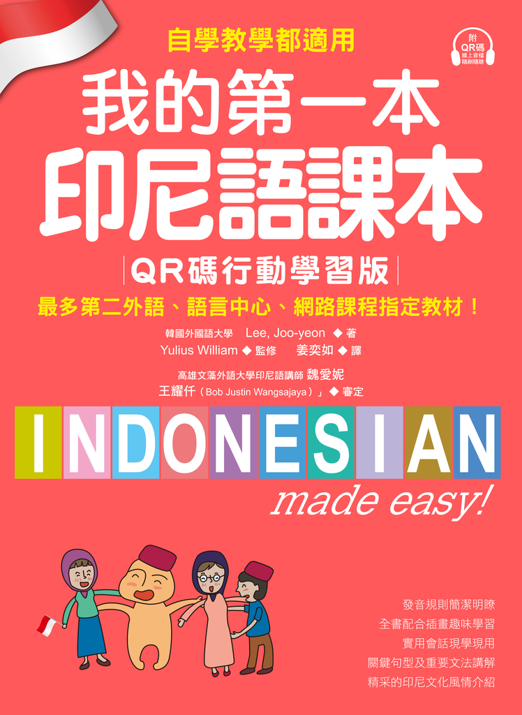作者介紹 作者簡介Lee, Joo-yeon韓國外國語大學印尼語系學士,國際地域研究所東南亞學系碩士。曾赴印尼當地進行語言研修,也曾任朝鮮日報大學生實習記者、外交部舉辦青少年交流團代表、阿里郎電視節目Hand-in-Hand印尼語通譯。審定者簡介魏愛妮現任文藻外語大學印尼語講師。印尼Universitas Kristen Krida Wacana會計系畢業之後,在台商公司就業三年。2008赴台灣留學,獲得文藻外語大學華語文教學研究所碩士。學成任教(印尼語)於文藻外語大學迄今。印尼語教學方面的專長包括:印尼語教學以及印尼華人文化研究。Yulius William印尼語監修人員。王耀仟(Bob Justin Wangsajaya)華裔印尼人,國立臺灣大學中文系畢業,專攻對外華語及印尼語教學,自2018年起從事印尼語教學工作,於2020年至雅加達任教,諳熟中、英兩項外語,並擁有專業翻譯經驗。私下熱愛外語學習,在法語、日語、閩南語、粵語等語種的研究亦小有心得。於 INSTAGRAM 上開設免費對外華語學習平台(簡體中文,印尼語講解,請打 mandarin.flashcards 搜尋)。譯者簡介姜奕如畢業於中國文化大學韓文系。從小受到電視的影響,對韓國文化產生了濃厚的興趣。進入大學後,藉由廣泛閱讀和旅行,對韓國的人文有了進一步的了解,得以在目前的翻譯中,用最貼近的詞語呈現。如今,越來越享受工作、享受生活,在文字的世界中豐富生命,快樂學習。