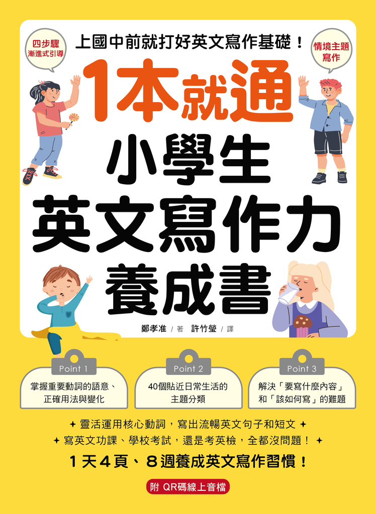 內容簡介 寫出流暢英文句子和短文, 寫英文功課、學校考試,還是考英檢,全都沒問題!1 天 4 頁、8 週養成英文寫作習慣,幫助孩子在進入國中前奠定英文寫作力,寫作訓練同步提升「邏輯、組織、單字、文法」的英文能力,再也不怕上國中才練來不及、時間不夠用,未來更能輕鬆掌控學習進度與生活!本書從理解英文句子的「靈魂」──「動詞」開始,掌握重要動詞的語意、正確用法與變化,並結合 40 個貼近日常生活的主題分類,實際運用單字、句型、文法、慣用表達寫出通順有邏輯的英文句子與文章,學會正確寫作方法!不管是英文功課、考英檢,還是升學考試,無論什麼題目,都能順利解決「要寫什麼內容」和「該如何寫」的問題!讓你在有限時間裡寫出高分作文!想要培養英文寫作能力,便要在生活中保持寫英文的習慣,本書提供貼近日常生活的各種主題, 從單字開始漸進式引導學習,減低對練習寫英文句子的反感與壓力,無論是平日輕鬆練,還是利用寒暑假集中練習,都能自然而然提升孩子的英文寫作能力!無論是平日寫學校作業,還是準備升學考試,都會遇到必須用英文寫句子或文章的時候,如果沒有從小養成隨手便可寫出英文句子或短文的習慣,那麼未來一旦碰到必須要寫的場合,就必定會覺得困難重重、寫不出來,因為「不知道要寫什麼」,而且也「不知道要怎麼寫」。想要擁有優秀的英文寫作能力,最好的方法不是硬背範文,而是一天花一點時間動筆親手寫英文,無論寫的是單字、句子還是短文,只要開始寫,就能漸漸抓住寫英文的手感和語感,培養出無論什麼主題或體裁都能寫的能力。本書所採用的主題,範圍廣泛且貼近孩子的日常生活,結合最能降低學習排斥、效果最好的漸進式寫作力養成法,利用「單字 → 句型 → 造句 → 串聯 → 短文」的設計,讓孩子先學習主題相關單字,再利用單字學習與主題相關的文法與句型,並提供寫作大綱思路及範文,先引導、後實際動手寫,讓孩子養成英文寫作必備的單字力、文法力和架構能力,未來需要加長篇幅時也不會寫不出來。1 天 4 頁,只要 8 週就能養成英文寫作的習慣,小小習慣造就巨大改變!無論是日常小練習,還是想要趁著寒暑假集中訓練英文寫作,都能運用本書有效提升英文寫作力!◇ 四步驟漸進式引導英文寫作練習,減少學習壓力,奠基更輕鬆!Step 1 認識核心動詞深入理解英文中一定要會的核心動詞字義、形態變化及用法,學會用法才能寫出正確句子。Step 2 看看別人怎麼寫閱讀緊扣當天主題的短文大綱思路及範文,仔細觀察核心單字的實際運用方法,並補充更多主題相關單字、片語及慣用表達方式。Step 3 依樣畫葫蘆利用前面讀過的範文模板,自己動手在空格中填入恰當的字詞,寫出一篇新的短文,加深實際運用單字、句型、文法及慣用語的感覺。Step 4 自己動手寫寫看利用前面仔細觀察過且練習填空過的大綱思路及句型表達,寫出一篇符合主題的短文。◇ 貼近日常生活的主題,事無鉅細皆可寫,再也不用煩惱「要寫什麼內容」! 從生活大小事出發,讓孩子學會觀察日常生活中的方方面面,流暢用英文寫出自己想說的話,未來無論遇到什麼題目都可以找到可以寫的切入角度,徹底解決「要寫什麼內容」的難題!◇ 詳細說明做為英文句子核心的各種動詞,不只記住、還能靈活運用不出錯!徹底理解英文句子中最常使用的核心動詞語意與用法,並透過「1 分鐘小教室」專欄補充更多寶貴的相關資訊,針對英文奠基期容易混淆的用法詳細解說,讓單字成為真的能夠拿來用在句子裡的寫作工具,自然大幅提升英文寫作能力! ◇ 一併補充基本文法知識、常見慣用表達及相關主題資訊,句型運用更加靈活、不呆板!透過「Grammar Check」專欄,學會英文寫作中不可或缺的正確文法與句型知識,再搭配「Learn More」中豐富多樣的學習內容,寫出來的句子及短文,句型變化更豐富、用字遣詞及內容更多元有趣!◇ 每週進行複習測驗,即時檢視學習成效,找出學習盲點、確保練習成果!特別設計每五天一回的「Review Test」,階段性自我檢視和複習每週學習的單字、句型、片語和慣用語等內容,透過複習和檢討來找出自己的學習弱點,提升學習成效!本書特色◆ 1 天 4 頁、8 週養成英文寫作習慣,無論是日常小練習,還是寒暑假集中練,一本通用!◆ 40 個貼近日常生活的主題,從上體育課到去露營都可以寫,選題廣泛、範圍多元又有趣!◆ 漸進式「單字 → 句型 → 造句 → 串聯 → 短文」寫作力養成法,培養英文寫作力更扎實!◆ 從最重要的基本動詞出發,學習必備情境句型、相關用法及造句方式,寫出正確句子沒問題!◆ 利用心智圖釐清主題情境及大綱方向,讓寫作思路更清晰、內容有層次,扣緊主題避免離題!◆ 提供模擬範文及補充單字供參考,先引導練習後獨立寫作,逐步養成、寫起來更有方向!