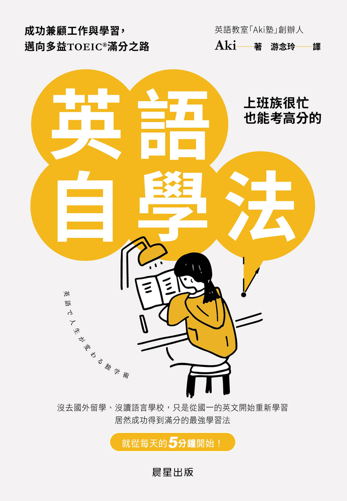 作者介紹 Aki英語教室「Aki塾」創辦人,一名以英語為武器的創業家。日本新潟縣出身,大學畢業後曾進入出版社工作,後成為日本公務員。公務員時期一邊工作一邊自學英語,從中學一年級的英文程度開始複習,最後取得TOEIC L&R TEST滿分、英検一級的成績,也順利考取日本導遊證照。擁有卓越的英語能力後,決定辭去公務員一職,轉而從事英語教練、指導英語學習技巧,並創辦英語教室。人生哲學為擺脫束縛、享受生活。除了在Twitter、部落格上分享自己的英語學習法及生活方式,也透過免費電子報傳授取得多益TOEIC滿分的戰術。Twitterhttps: twitter.com mikorino電子報http: gengomanabi.com stoicmember formadd ?group_id=11部落格https: gengomanabi.comInstagramhttps: www.instagram.com toeic.aki_style譯者簡介游念玲畢業於輔仁大學日本語文學研究所,喜愛日本文化裡寧靜而細膩的美感,如果能把這種感動傳達給讀者諸君,就是最幸福的時刻。【個人信箱】[email protected]