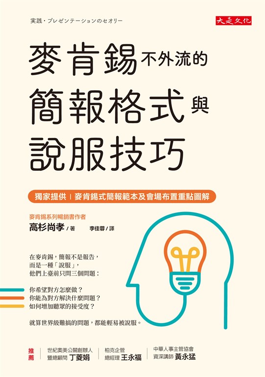 產品目錄 推薦序一 簡報,就是把禮物送給觀眾/黃永猛推薦序二 簡報力,就是競爭力!/王永福前言 在麥肯錫,簡報代表「說服」,不是報告第1部 簡報前,麥肯錫菁英必問三件事第1章 你希望對方怎麼做?第2章 你能為對方解決什麼問題?第3章 如何增加說服力?第2部 麥肯錫的最強項:正確定義問題第4章 所有問題,都可歸納為三種類型第5章 恢復原狀型的問題,要五要件第6章 防杜潛在型的問題,要想兩對策第7章 追求理想型的問題,要突顯落差第8章 結合不同問題描述的組合技術第3部 能成功傳遞訊息的版面設計第9章 金字塔版面結構,內容不超過七頁第10章 文字頁的基本結構──正誤釋例第11章 圖表頁的運用要領第12章 圖表與文字,你得這樣組合特別提供 公司內部的迷你簡報,該怎麼設計格式?──A4報告第4部 麥肯錫菁英怎樣準備、怎樣上臺簡報第13章 單刀直入由上而下,否則必遭曲解專欄 由上而下法的簡報要這樣做第14章 聽眾的疑問,就是最好的說服捷徑第15章 肢體語言,也是簡報的重點第16章 策略性的簡報穿著與臉部表情第17章 簡報會場的注意事項圖解第5部 簡報的大忌:我怯場了!第18章 成功的簡報,來自容許失敗