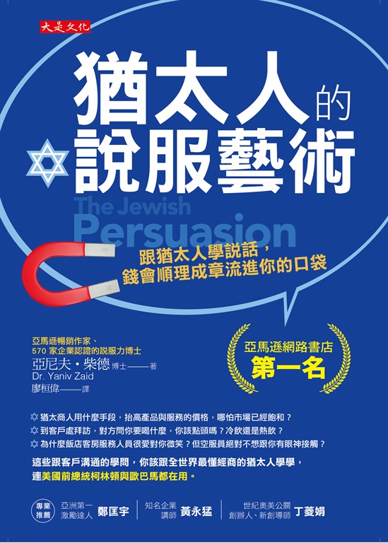 內容簡介 亞馬遜網路書店商管類暢銷書第一名 ◎以色列這個流亡猶太人建立的小國,怎麼成為世界最多新創公司的國家? ◎猶太商人用什麼手段,抬高產品與服務的價格,哪怕市場已經飽和? ◎到客戶處拜訪,對方問你要喝什麼?你該點頭嗎?冷飲還是熱飲? ◎為什麼飯店的客房服務人員很愛對你微笑?但空服員絕對不想跟你有眼神接觸? 這些說服顧客的學問,你都可以跟全世界最懂經商的猶太人學學, 連美國前總統柯林頓與歐巴馬都在用。 (柯林頓還是美國歷任總統中聘用最多猶太幕僚的) 本書作者亞尼夫‧柴德就是猶太人, 是超過570家企業認證的「說服力博士」, 全球有超過40萬人看過他的YouTube頻道;主講過1650場以上的講座, 為什麼他的演說可以這麼有魅力? 因為他把猶太人特有的說服藝術灌注到演說裡,很多人因此受惠。 ◎在提供解答前先銷售問題,顧客就不會跟你殺價 為什麼同樣的花,婚禮花束就是比一般花束貴五倍? 因為研究顯示,人們會在三個領域花很多錢:健康、婚禮與小孩。 當問題或需求對顧客而言越重要或緊急,人們就願意花大錢買解答。 ◎錨定效用、社會認同、眼神接觸,都能讓客戶更快點頭。 服務生怎麼預先知道你要點酒?很簡單,利用錨定。 酒吧每晚收到的第一筆小費,誰給的?他自己投進罐子裡的!這就是社會認同。 還有,眼睛看著對方,就是一種引誘,是快速成交的心理戰術。 但,為什麼空服員絕對不想跟你有眼神接觸? ◎猶太人三長處:正向、厚臉皮、正向厚臉皮 擔心自己辦的講座沒有人來聽?沒有關係,就算沒人聽也要厚臉皮辦下去, 萬一搞砸呢?很簡單,儘快再講一場、然後第二場、第三場……因為,別人對你的評價只會看你最近的那一場。這就是猶太人成功的主因:「正向厚臉皮」。而且,不管有沒有人來,現場一定要有點心。◎行銷文案第一守則:「像在說話一樣」 想讓人聽你說話、讀你文章的關鍵字第一名是?(我跟你說一個祕密……) 怎樣的關心語,會讓對方想追隨你?學學美國前總統歐巴馬寫給選民的信。 還有,說哪一句話最能讓人採取行動?(第七章會告訴你)石油大亨洛克斐勒、投資大師華倫.巴菲特、微軟公司創辦人比爾.蓋茲,社群網站臉書創辦人馬克.祖克柏,這些人有何共通點?他們都是猶太人! 所以,跟全世界最有錢的猶太人學說服藝術,錢會順理成章進你的口袋。