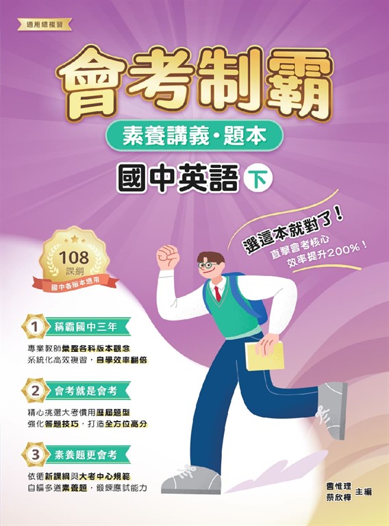 最佳賣點 : 素養講題:【會考制霸】國中英語針對大考關鍵點,結合108課綱素養精神,依日常生活主題分章,從校園生活至興趣愛好,掌握會考情境入題趨勢。本書根據主題詳列相關單字、句型與文法,加速學習效率,全方位提升學生英語素養能力。各章收錄歷屆試題與素養題,掌握大考作題訣竅,可搭配線上影音課程,使英語總複習事半功倍。