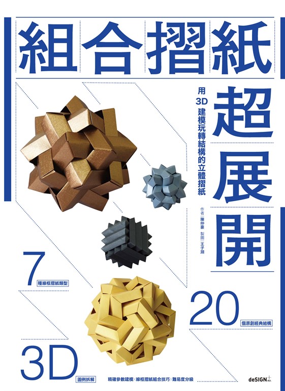 組 合摺紙是一種摺紙技巧,也可以視為一門結合幾何、數學和創意的藝術形式。本書主要以「線框型組合摺紙」(Wireframe)為題,結合電腦建模的精密計