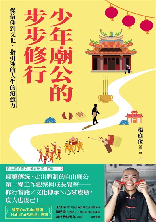 作者介紹 楊庭俊(廟公) 從小在宮廟場域耳濡目染,特別喜愛宗教與文化事物。2013年,為了拯救同學,開啟濟世道路。2017年,大學畢業後,一進職場就擔起蓋廟大業,成為蓋廟駐廟的「少年廟公」,燒香、掃地、誦經、收驚,樣樣要做,練就了一身技能。只是有感於大廟有些門檻,不是每個人都有機會進到廟內問事,因盼望自己能和更多心中有信仰的人相遇,成為他們心中那間廟的廟公,便開始雲遊四海。 在自我實踐的道路上,為不侷限自己只有宗教的角色,所以有了多方的嘗試:擔任過國語日報特約專欄寫手、涇川德芝慈惠堂開山廟公暨顧問、溪洲觀沁閣總幹事、土地公國際民俗藝術節企劃、土地公文化館神之將特展策展人、臺灣月琴民謠祭主持人、廟會攝影師、學甲慈濟宮大廟導覽員、牙醫與衛教活動行銷,用各式各樣的角色、形式去記錄與傳遞知識和觀念,泛出「善」的漣漪。 信念是「離經叛道何妨,裝瘋賣傻無差,心繫眾生就好」,期望自己像濟公禪師一樣不受拘束,讓人感到親切,行走天下,遇見每個有需要的人! Instagram @ miaogong1022臉書粉專:少年廟公