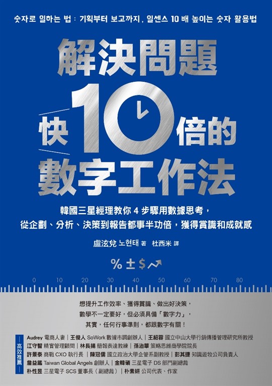作者介紹 盧泫兌(노현태)大學主修資訊系統與工業工程。2007年加入韓國三星電子,進入DS部門半導體記憶體製造技術中心,擔任生產規劃師。現在,他是晶圓廠FAB2團隊規劃經理,負責評估製造相關的投資計畫,並檢視可能的限制條件。他認為,數字是工作中不可或缺的工具,可以讓工作更精確、讓意見更客觀,也讓報告更出色。為了幫助上班族更輕鬆應對工作,他將自己近20年的數字工作法寫成書,希望為讀者提供實用的技巧和啟發。
