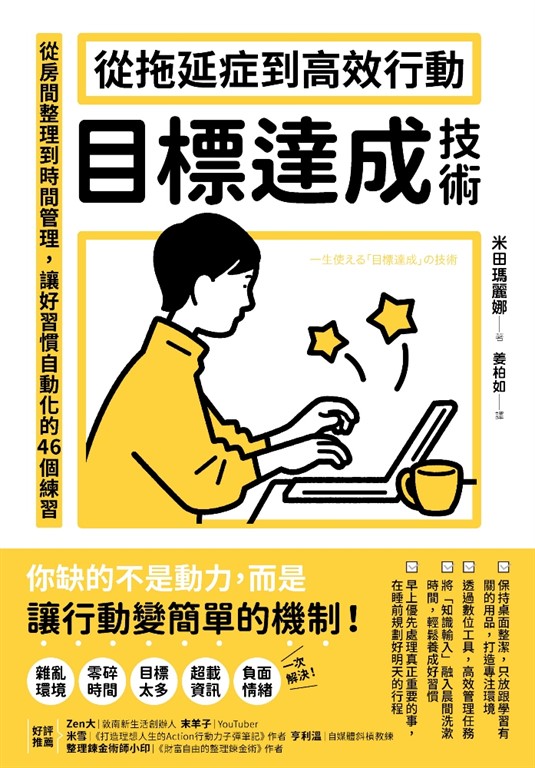 內容簡介 達成目標不靠意志力,關鍵在於打造自動運作的「目標達成機制」!只要兩步驟,科學化整理術 X建立自動機制讓你輕鬆養成習慣、高效行動!你是不是也曾下定決心下班後要積極進修,卻總是藉口拖延、分心、三分鐘熱度就放棄?其實,你缺的不是動力,而是「讓行動變簡單的機制」。 全職上班族卻能考取MBA、持續進修、經營副業作者米田瑪麗娜是人氣整理收納顧問。不只會收納空間,更擅長管理時間!她在全職工作之外,不僅將副業經營得有聲有色,還念完MBA、考到不動產經紀人資格、進修商務英文和中文會話,同時每年持續撰寫一本書。她是怎麼做到的? 比起強大的意志力,「自動機制系統」更重要她的祕訣是:先用「科學化整理術」整理生活各面向,包含環境、時間、資訊、思考、情緒等,再透過「機制化」把實踐步驟內建成日常習慣, 只要兩步驟,啟動你的自動執行系統。STEP 1 科學化整理術:排除干擾,打造專注環境 減少使用社群媒體,暫停關注與目標無關的資訊 善用數位工具提醒日常瑣事,節省大腦記憶體,讓我們專注於更重要的事 定期召開斷捨離會議,找出自己「獨處、工作、社交」時浪費的時間STEP 2建立自動機制:輕鬆養成好習慣 刻意培養「一心多用」的生活習慣,如吹頭髮時深蹲、做家事時聽書等 把門檻變低,讓執行更容易,與其一次學習三十分鐘,先讀十分鐘就好 每週安排固定時段打掃,平時利用零碎時間進行三分鐘簡單整理不靠強大意志力,也能讓你每天自動啟動、自動前進,最終實現目標!本書適合 想要自我提升,卻因為工作忙碌無法持續的人 不想要太累,想用更聰明的方法創造成果的人 想把好習慣變成「不用努力也會做的事」的人本書特色 作者親身實證:身為全職上班族,也能取得MBA學位、考取證照、建立副業,並提供親身實踐後,最快、最有效實現目標的46個練習。 趣味漫畫導讀:由不可思議的兔兔老師帶領,幫助你從三分鐘熱度變身高效達人。