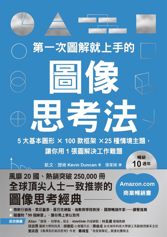 內容簡介 \全球熱銷突破250,000冊,圖像思考經典/=風靡20國、暢銷10週年,全新升級版=5大基本圖形 × 100款圖像思考法 × 25種情境主題★★★★★Amazon.com商業暢銷書微軟行銷長、索尼董事、星巴克總監、倫敦商學院教授、國際暢銷作家⋯⋯一致讚聲推薦遇到問題、想法混亂、溝通卡關時⋯⋯不必糾結,也不靠長篇大論,只要畫對1張圖,就能釐清邏輯、突破盲點,快速解決工作與生活中的難題!※隨書附「99個練習」,讓你馬上學以致用※►風靡20國,全球頂尖人士推崇的圖像思考英國暢銷作家、商業顧問、斜槓行銷專家凱文.鄧肯,10年前發現,越來越多學員不再只用文字筆記,而是開始用他課程中教的圖表「畫」出思考。於是,他把課程教材中的50種圖像思考法集結成書,出版後大受好評,獲得商業顧問、跨國企業主管、學者、MBA學生等頂尖人士推崇,更售出20國版權,包括:法國、德國、義大利、中國、印度、日本、韓國、泰國⋯⋯幫助無數人用圖像像釐清思緒、化繁為簡、有效解決問題。►日趨複雜的世界,視覺圖像成為化繁為簡的關鍵工具經過10年,面對資訊爆炸、驟變加劇的AI時代,視覺圖像,可以把抽象思考具體化,達到跨文化、跨語言、跨領域的溝通,是最快速、最具說服力的表達方式。►5大基本圖形 × 100款框架 × 25種關鍵主題,最快1分鐘解決問題為了與時俱進,鄧肯根據多年的實務經驗,並蒐集多方意見,同樣運用5大基本圖形,把50款圖像思考法,擴增到100款──.20款「三角形」思考法:銷售金字塔、學習三角錐、簡報星形圖、價值楔形圖⋯⋯.20款「方形」思考法:優先事項矩陣、時間管理矩陣、周哈里窗、知識掌握網格⋯⋯.20款「圓形」思考法:文氏圖、核心概念衛星圖、工作生活平衡圖、問題循環圖⋯⋯.20款「時間軸」思考法:每天進步1%曲線圖、隱形潛能高原圖、習慣線表⋯⋯.20款「流程圖」思考法:組織圖、沙漏圖、決策樹狀圖、問題去個人化概念圖⋯⋯本書最後還提供25種常見情境索引,包括:決策、效率、溝通、創意、報告⋯⋯無論是寫筆記、做簡報、決策分析、創意思考、時間管理或團隊合作,只要對應情境、找到圖形,最快1分鐘,1張圖就能梳理邏輯、突破盲點,從此習慣用圖像思考,成為溝通達人、解決問題的高手!