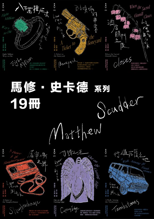 內容簡介 馬修.史卡德系列紐約犯罪風景塗繪全新設計版套書(十九冊) 生命自持 人生縱使百分之九十八都是徒然,也要找出那百分之二的存在意義 有人從馬修.史卡德身上讀到了堂吉訶德,有人看到了卡拉馬助夫兄弟; 有人說他是班雅明筆下「複製時代的抒情詩人」「不行者」; 有人則相信他是推著石頭上山的現代薛西佛斯; 馬修.史卡德像面鏡子,人人都可在他身上照見到自己,照見到比敘事更多的其他東西。 1973年卜洛克創造史卡德 1994年卜洛克榮獲愛倫坡獎終身大師獎 1998年《八百萬種死法》引進台灣 有「紐約犯罪風景的行吟詩人」之稱的卜洛克,對死亡有深澈特殊的感受,把半世紀前漢密特、錢徳勒所締建的美國犯罪小說傳統,推到另一個史無前例的新高度。 「馬修.史卡徳」是卜洛克最受歡迎的系列。透過一名無牌私家偵探的戒酒歷程,寫盡紐約的豐饒、蒼涼和深沉。此系列從一九七○年代一路寫到新世紀,在線性時間流淌聲裡,顯現人性的複雜明暗,以及人間命運交叉的種種因緣起滅。論者以為其勝處已超越犯罪小說範疇,而達於文學經典地位。 國際知名導演王家衛想拍卜洛克的電影 影帝梁朝偉當導演最想拍的也是偵探史卡德的故事 史蒂芬.金認為能取代名偵探Travis McGee的只有Matthew Scudder 朱天心 × 朱天文 × 李維菁 × 侯孝賢 × 唐 諾 × 張大春 張國立 × 陳 雪 × 詹仁雄 × 劉梓潔 × 駱以軍 × 顏忠賢等知名作家和導演都抵擋不了馬修.史卡德的魅力。 *無牌戒酒私探馬修.史卡德的十九個人生故事 1、1976年\《父之罪》\The Sins of the Fathers 離家多時的女孩被亂刀砍死,同居的嫌犯很快被抓到且在監獄自殺謝罪,女孩的父親覺得事有蹊蹺,委託史卡徳查明真相——兩個在家庭中無法獲得溫暖的人藉彼此的「缺憾」逐漸治療自己的心病,「父親」,對她和他而言,是沉重而無法負擔的圖像。 2、1976年\《在死亡之中》\In the Midst of Death 傑瑞.布羅菲爾是紐約警局的警察,他和檢察官合作,以調查警方貪污的真相,他的同僚對此不以為然。一名來自英國與他過從甚密的妓女,被人發現死在他曼哈頓的公寓裡——他是凶手嗎? 3、1977年\《謀殺與創造之時》\Time to Murder and Create 1978年愛倫坡獎最佳小說入圍 史卡德的朋友「陀螺」交給他一封封得緊密的信,他告訴史卡德,要是某個星期沒有接到他報平安的電話,就打開信封,所有問題的解答都在裡面。 4、1981年\《黑暗之刺》\A Stab in the Dark 1982年夏姆斯獎最佳小說入圍 九年前,一個瘋狂的冰錐殺手連續刺殺好幾位女性後逃逸,九年後,紐約警方在偶然的機遇下逮到此人,所有案件他都承認,唯獨芭芭拉的案子。芭芭拉的父親委託史卡徳找出凶手。 5、1982年\《八百萬種死法》\Eight Million Ways to Die 1983年夏姆斯獎最佳小說 1983年愛倫坡獎最佳小說入圍 我名叫馬修.史卡德,是個酒鬼。有個我認識的女人昨晚被殺。她僱我保護她的安全,我拍胸向她保證沒問題。殺她的凶手誑了我,而我相信他,結果她死了,現在我做什麼都於事無補。這個念頭不斷的在啃我、囓我,叫我坐立難安。喝酒不能讓她起死回生,但不喝酒也是一樣。他媽的我為什麼得活得這麼辛苦?為什麼? 6、1986年\《酒店關門之後》\When the Sacred Ginmill Closes 1987年安東尼獎最佳小說入圍 1987年麥卡維帝獎最佳小說入圍 1987年夏姆斯獎最佳小說入圍 本書由三個發生在酒店的案件編織而成,三宗謎題奢侈的全展演在一本書之中,卜洛克的慷慨還不只如此,事實上,他私心關注的焦點是罪案所在的背景:酒店,和酒店中各色各樣滄桑的人們。 7、1989年\《刀鋒之先》\Out on the Cutting Edge 1990年夏姆斯獎最佳小說入圍 史卡徳受託尋找失蹤三個星期的女孩,案情毫無進展,這女孩就像空氣一樣的消失無蹤;同時戒酒協會的朋友艾迪,在滿腹心事來不及說出口的狀況下,被史卡徳發現吊死在住處。她到哪裡去了?他有什麼難以啟齒的心事?史卡徳能幫上多少忙? 8、1990年\《到墳場的車票》\A Ticket to the Boneyard 1991年安東尼獎最佳小說入圍 1991年夏姆斯獎最佳小說入圍 史卡徳仍幹警察之時,他的妓女兼房地產專家伊蓮被一名完事後不付錢、熱愛各種殘酷性虐待遊戲的惡徒纏上,馬修布置了一個陷阱順利送他入獄。多年之後壞人回來開始施展全面性報復,揚言要除盡史卡徳所有的女人,並打算把他本人像貓爪下的老鼠般玩弄到最後。 9、1991年\《屠宰場之舞》\A Dance at the Slaughterhouse 1992年愛倫坡獎最佳小說 1992年夏姆斯獎最佳小說入圍 拳擊台觀眾席上,一名男子把手放在一個狀似他兒子的小男孩額頭上,溫柔的把頭髮往後攏,然而對瞥見這一幕的史卡徳而言,卻如被雷擊般彷彿看到該隱的印記一一一個記敘著謀殺和死亡的印記。 10、1992年\《行過死蔭之地》\A Walk Among the Tombstones 2014年改編電影上映,由主演《即刻救援》的硬漢男星連恩.尼遜擔綱演出 毒梟的妻子遭人綁票,歹徒要求巨額贖金,結果送回的竟是塊塊屍骨。史卡徳受命追索凶手,過程中與凶手一路鬥智,並在最後一刻救出另一樁綁架案肉票。 11、1993年\《惡魔預知死亡》\The Devil Knows Youre Dead 1994年夏姆斯獎最佳小說 1994年卜洛克獲頒愛倫坡獎終身大師獎 一名律師被人槍殺在夜暗的紐約街頭,而警方找到的凶手是一名終日遊晃街頭精神有問題的遊民,整個城市引起一陣恐慌,議論不斷,但是嫌疑犯的弟弟不相信受越戰刺激的哥哥會是凶手,央求