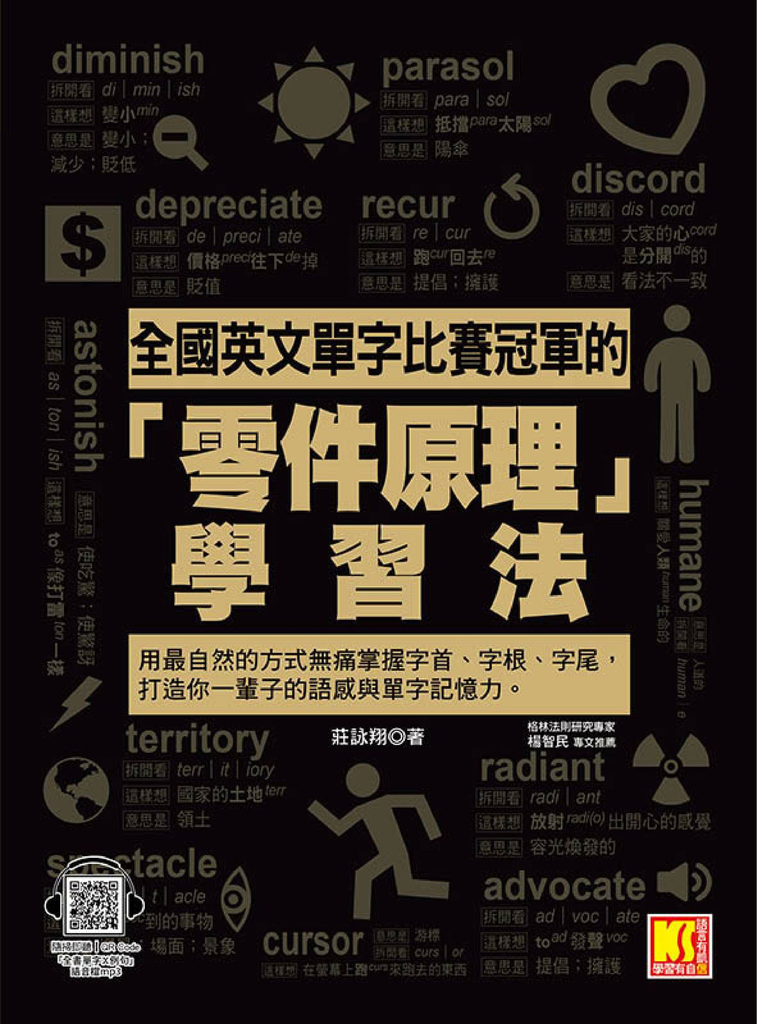 內容簡介 高手都是這樣背單字!「零件原理」學習法:拆解+聯想,單字可以學更快,而且一輩子不忘記! ★★無痛記單字,只有這本書辦得到! 從高職生、英語拼字冠軍、新世代語言書作者,如今再晉身第一線教師, 全國單字比賽冠軍—莊詠翔,將自身學習歷程轉化他人可以參照的模式, 分享創新單字記憶密技—「零件原理」學習法, 教你用最自然的方式,無痛掌握字首、字根、字尾記憶法, 打造你一輩子的語感與單字記憶力。 ★排行榜百大暢銷書作者 ★FB、IG粉絲頁,LINE社群、Podcast超高人氣學習法 ★在大學生時期,即擔任國高中學校講師 ★獲青春博客來OKAPI〔學習力倍增〕單元人物專訪 【本書內容】 有效的學習,不只是單純記一個字,而是必須理解單字的構造與意涵。相信很多學習者有接觸過傳統字根首尾記單字的方式:先記憶字根首尾,再將相關單字記起來……但這很容易有「另外要再增加記憶許多字」的感覺,無法得到明顯成效,有時甚至還不如直接死背單字比較快……因此容易產生成效不彰的狀況。 而創新的零件原理:「先拆解,再聯想」單字記憶法,則能克服傳統學習的缺點,讓字根首尾單字記憶法變得更輕鬆上手,並發揮數倍效果。 ★★「零件原理」優勢 •從已知學習未知: 從原本已知的單字,去延伸學習其他未知單字,簡單又快速。 例如.microphone(麥克風) ↗ micro(微小)→ microscope(顯微鏡) ↘ phon(聲音)→ symphony(交響樂) •推論勝於死背: 透過一樣字根的單字們,去拆解和聯想,再去記憶字根。 例如. include:in-(裡面)+clud(關)+-e(動詞字尾) 聯想:把東西關到裡面 → 意思:包含;包括。 exclude:ex-(外面)+clud(關)+-e(動詞字尾) 聯想:把東西或人關到外面 → 意思:排除;阻止某人進入。 occlude:oc-(前面)+clud(關)+-e(動詞字尾) 聯想:前面的路被關上 → 意思:阻塞。 依此類推,即能推論許多陌生單字意思。 ◈獨創練習題模式 •透過每個單元獨創的學習模式:「詞素觀察練習」與「語意歸納活動」,認識零件。 •練習題經測試,適合所有程度的學習者。 •透過簡單易懂的文字與練習,推敲零件意思,讓「接觸單字」這件事變得輕而易舉。 ◈巨量單字及必學零件 •透過大量的單字練習,能更快速對應字根首尾意涵。 •零件的樣貌與意思會在單字裡重複出現、拆解而被深深記憶。 •利用充滿巧思、創新的「拆開看」零件分解、相關聯想「這樣想」,進而記憶「意思是」來學習單字。 •例句設計貼近字義,更能理解單字,並學會應用。 ◈生動的零件小故事 延伸補充你可能不知道的英文字彙有趣的發展、進化小故事,同時提供更多零件學習、記憶技巧,記單字變得更趣味生動。 ◈快速複習一覽表 每一章節學習後,可利用精心整理的一覽表,將零件和單字隨時密集複習,再次熟悉與掌握字根首尾的對應,單字印象更深刻,不忘記。 適用對象 •一開始便能打好基礎的初學者 •從單字學習中脫困者 •欲大考逆轉勝的考生們 •想真正理解單字、記憶單字者 •澈底想要學會字根首尾學習法的人【本書特色】1.記單字得心應手收錄橫跨國高中、多益、英檢單字。只要熟悉「零件原理」學習法之後,即使遇到雅思、托福等需要背更難單字的考試,也會易如反掌。2.記憶邏輯的學習欄位「拆開看」:幫助理解單字結構與組成;「這樣想」:引導對組成零件做意義上的聯想;「意思是」:補充清楚定義,簡潔有條理;「學更多」:進一步引導字根探索與應用。3.學習能自然內化首創「目錄挖空設計」,學習者需在學習過程中逐步填入主題與詞素分類,達「參與-建構-內化」目的。4.最大效益的編排邏輯閱讀順序皆經過精心安排,從練習題到零件學習,再到單字欄位的排列設計、縮小詞素設計,並輔以中文說明……能讓學習專注、持續,觸類旁通。●格林法則神人「楊智民」老師 大力推薦●
