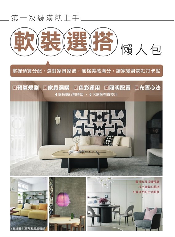 產品目錄 Chapter 1 採購行前須知 Part 1 檢視空間條件 Part 2 釐清採購預算 Part 3 確認採買策略 Part 4 選購管道 Part 5 清潔保養、退換貨須知Chapter 2 風格家具家飾 Part 1 北歐風 Part 2 現代風 Part 3 日系無印風 Part 4 Loft 風 Part 5 工業風 Part 6 侘寂風 Part 7 復古風 Part 8 鄉村風 Part 9 美式風 Chapter 3 色彩組合 Part 1 色彩組成 Part 2 空間三原色:材料色、塗料色、軟裝色 Part 3 色彩情緒氛圍 Part 4 公私領域配色 Plus 風格的配色法 Chapter 4 材質運用 Part 1 對比反差 Part 2 協調統一 Part 3 特殊材質選用 Chapter 5 燈具配置 Part 1 色溫與照度運用 Part 2 照明方式 Part 3 燈具類型 Part 4 空間燈光配置Chapter 6 家飾搭配 Part 1 配置原則 Part 2 家飾種類與搭配 Chapter 7 空間布置 Part 1 玄關 Part 2 客廳 Part 3 餐廚 Part 4 臥房 Part 5 書房 附錄 家具家飾選配表