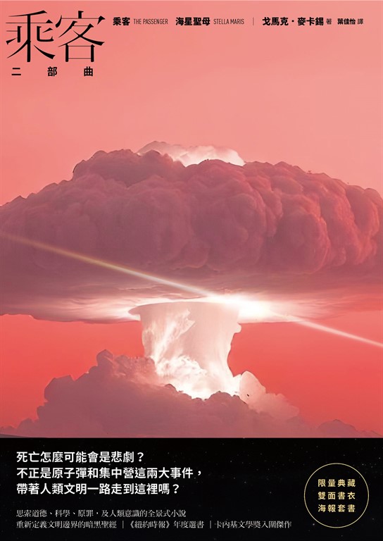 內容簡介 普立茲獎得主、《長路》、《險路勿近》原著小說作者醞釀50年 人生最終鉅獻《紐約時報》、《科克斯書評》、Goodreads書評網年度選書卡內基文學獎入圍傑作思索道德、科學、原罪,及人類意識的全景式小說《紐約時報》年度選書 卡內基文學獎入圍傑作麥卡錫追隨者讚嘆:「在看電影《奧本海默》之前一定要讀的一本書!」有關麥卡錫──他是浪跡荒漠的天才思想家,曾經隨身一只燈泡用來夜間閱讀、一個櫃子裝滿藏書突然現身文壇獲譽海明威、福克納唯一繼承人人生最後十年與世界頂尖科學家共事集結畢生研究精華寫就本書──一部親手詮釋讚頌科學與信仰、重新定義人類意識邊界的暗黑聖經她是天才物理學家,看盡生命起落,二十歲就選擇在療養院度日……一個謎樣的女孩 卻可能是文明進展至此刻的重要解答▍本書特色1‧麥卡錫是曾獲歐普拉、《西方正典》作者哈洛‧卜倫、《斷背山》作者安妮.普露盛讚,畢生致力科學與哲學研究的當代奇才小說家。歐普拉曾讚美他是美國當代最重要的一位作家,作家在小說中灌注畢生思辨過程,可謂是「記錄人間起落」的全景式小說2‧麥卡錫關注世界的動向,人類心智無法自拔的墮落現象,交織科學與哲學思索,像二十一世紀的福克納,又多了一絲海明威昂揚的陽剛氣息,更遙遙呼應韋勒貝克對人類文明徹底失去信心的通透觀察3‧《紐約時報》《華盛頓郵報》《出版者週刊》《書單》《洛杉磯時報》《科克斯書評》《君子》《歐普拉日報》一致推薦普立茲獎得主、《長路》、《險路勿近》原著小說作者醞釀50年 人生最終鉅獻★首刷限量全球獨家贈雙面書衣海報‧一次收藏兩本麥卡錫神視角大作★死亡怎麼可能會是悲劇?不正是原子彈和集中營這兩大事件,帶著人類文明一路走到這裡嗎?思索道德、科學、原罪,及人類意識的全景式小說《紐約時報》年度選書 卡內基文學獎入圍傑作麥卡錫追隨者讚嘆:「在看電影《奧本海默》之前一定要讀的一本書!」有關麥卡錫──他是浪跡荒漠的天才思想家,曾經隨身一只燈泡用來夜間閱讀、一個櫃子裝滿藏書突然現身文壇獲譽海明威、福克納唯一繼承人人生最後十年與世界頂尖科學家共事集結畢生研究精華寫就本書──一部親手詮釋讚頌科學與信仰、重新定義人類意識邊界的暗黑聖經《紐約時報》、《科克斯書評》、Goodreads書評網年度選書卡內基文學獎入圍傑作他不斷地逃,逃向遠方,回望歷史上最天才的一群人鑄下大錯,自問該怎麼活下去?又該如何面對死亡?殺戮與暴力真的是罪嗎?世界不是已經夠糟糕了?她是天才物理學家,看盡生命起落,二十歲就選擇在療養院度日……一個謎樣的女孩 卻可能是文明進展至此刻的重要解答▍本書特色1‧麥卡錫是曾獲歐普拉、《西方正典》作者哈洛‧卜倫、《斷背山》作者安妮.普露盛讚,畢生致力科學與哲學研究的當代奇才小說家。歐普拉曾讚美他是美國當代最重要的一位作家,作家在小說中灌注畢生思辨過程,可謂是「記錄人間起落」的全景式小說2‧麥卡錫關注世界的動向,人類心智無法自拔的墮落現象,交織科學與哲學思索,像二十一世紀的福克納,又多了一絲海明威昂揚的陽剛氣息,更遙遙呼應韋勒貝克對人類文明徹底失去信心的通透觀察3‧《紐約時報》《華盛頓郵報》《出版者週刊》《書單》《洛杉磯時報》《科克斯書評》《君子》《歐普拉日報》一致推薦有關《乘客》──為什麼明明只想逃,卻總被迫回到過往?回望歷史上最天才的一群人鑄下大錯,世界還有可能更糟糕嗎?一名乘客屍體在失事機艙內憑空消失,奉命潛入海中調查飛機殘骸的他盡責完成任務,離開水面後卻成了這樁懸案的替死鬼,遭到各方追殺。他從此步上無法回頭的逃亡之旅,不得不逃向他原本亟欲離開的地方……他們的父親當年參與打造原子彈,從此扭轉世界走向,繼承了天才資質的兄妹倆,為什麼一生像逃犯一般自我放逐?男人在黑暗裡跳入海中墜機殘骸,奉命尋找空難後遺失的黑盒子。沒想到任務尚未達成,反而成了竊奪機密的嫌疑人。他開始收拾家當,告別一切,尋找下一個落腳處,卻不斷有人追在他的身後。現實追殺他、國家放逐他,他只好一直逃、一直逃,直到瀕臨死亡深淵的邊界……在逃亡的過程中,他發現多年前參與奧本海默「曼哈頓計畫」的父親鬼魂、歷史上最難解的暗殺謎團,都與他和妹妹的命運難以分割……繼《長路》在新世界踽踽獨行的父子身影之後,過了十六年,麥卡錫交出人生最後創作,也是醞釀長達半世紀的畢生巨獻「乘客二部曲」。《乘客》與《海星聖母》二作互為表裡,集結麥卡錫畢生針對道德、科學、哲學,以及人類意識潛在瘋狂的「神視角」洞察,鳥瞰文明一路至此人類壯闊的集體心靈風景。有關《海星聖母》──一個握有一切關鍵解答的天才少女,為什麼選擇遁隱於世?他們說我瘋狂,我卻是因為太過清醒而放棄人生。活著,就是一場漫長的思辨。她是我們這個時代最天才的科學家,也是一口斷定人生毫無意義的瘋狂之人。她最清醒的選擇,就是在青春正盛之際,拎著滿滿一袋鈔票,走進海星聖母療養院,決定在此度過漫長的餘生……她從小天資優異,博士等級的數學與物理課程都令她乏味,她的精神狀態無法被現有的任何測驗定義,她預見自己的命運,和全人類的命運……當其他同齡的年輕人還在尋找