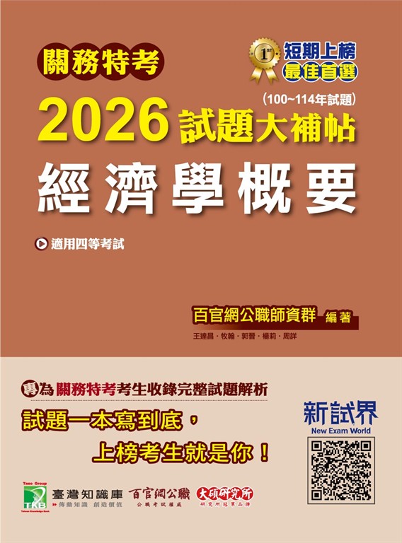 | 商品描述 | 關務特考2026試題大補帖【經濟學概要】(100~114年試題)[適用關務四等](CK4385) (電子書):1.此書為社內主要專門給報考就業考試的考生使用的歷屆試題書:此書適用於關務特考 |