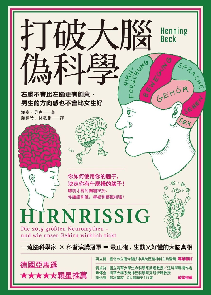 作者介紹 作者簡介漢寧.貝克杜賓根大學(Universität Tübingen)生物化學系畢業後,進入賀提研究中心(Hertie Institut)從事臨床腦科學研究。他在二○一二年取得神經生物學博士學位後,積極投入科普演講,以活潑生動的方式,幫助大眾建立正確腦科學常識。同年,拿下卡斯魯爾市(Karlsruhe)該年「科學演講競賽」(Science Slam)的冠軍。曾在柏克萊大學從事研究工作,並在著名的科學出版社Springer Spektrum出版了《靈光乍現之生物學》(Biologie des Geistesblitzes,暫譯)。譯者簡介顏徽玲輔仁大學德文系畢,德國比勒費爾德大學(Universität Bielefeld)語言教育碩士、神經語言學博士。目前任教淡江大學德國語文學系,譯作約二十餘本。透過翻譯可徜徉在不同的文化語言間,更可學習新知,所以她樂此不疲。林敏雅臺灣大學心理系畢業。留學德國特利爾大學。曾旅居日本、荷蘭多年,目前定居德國,從事德、荷文翻譯工作。