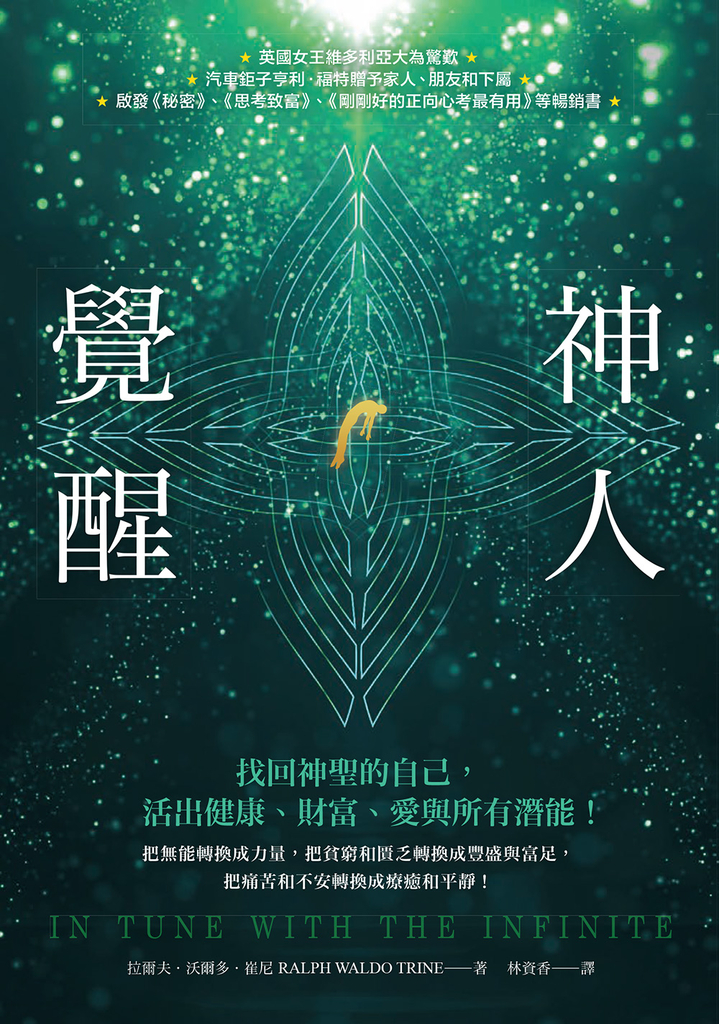 作者介紹 拉爾夫.沃爾多.崔尼Ralph Waldo Trine(1866年9月9日~1958年2月22日)新思想作家、哲學家,以及動物福利推動者、素食者,其思想深受德國哲學家費希納(Gustav Theodor Fechner)、美國思想家愛默生(Ralph Waldo Emerson)和蘇格蘭科學家兼傳道家德拉蒙德(Henry Drummond)著作的影響。崔尼的書對許多人都產生巨大影響,包括聖雄甘地(Gandhi)、「宗教科學」(Religious Science)精神運動創始人歐內斯特.福爾摩斯(Ernest Holmes),以及許多新思想作家。二十世紀沒有其他新思想作家比他賣出更多的書,他的影響遠遠超出新思想的圈子,觸及到大眾,許多人在讀他的書時從未意識到它們屬於新思想。林資香國立台灣大學圖書館學學士,美國伊利諾大學香檳分校廣告碩士。曾任職於廣告公司與航空公司,目前為文字工作者,專職翻譯、編輯與寫作,譯著涵蓋心靈成長、瑜伽、傳記、哲學、歷史、商業等領域,包括《西藏禪修書》、《西藏心瑜伽2》、《我嫁到不丹的幸福生活》、《昆達里尼瑜珈》、《我還記得前世》、《哈佛醫學專家的老年慢療八階段》、《禪修救了我的命》、《瑜伽中的能量精微體》、《瑜伽安全練習全書》、《心能靜下來嗎?》、《敬畏:微量正念快速練習術》、《爆買帝國》、《哲學的故事》、《暗殺世界史》、《興衰:菁英網絡演變與帝制中國》、《改變世界觀的20個偉人和100本書》、《開啟你的驚人天賦》、《天賦的力量:新時代教父內維爾最經典收錄》等書。聯絡信箱:[email protected]
